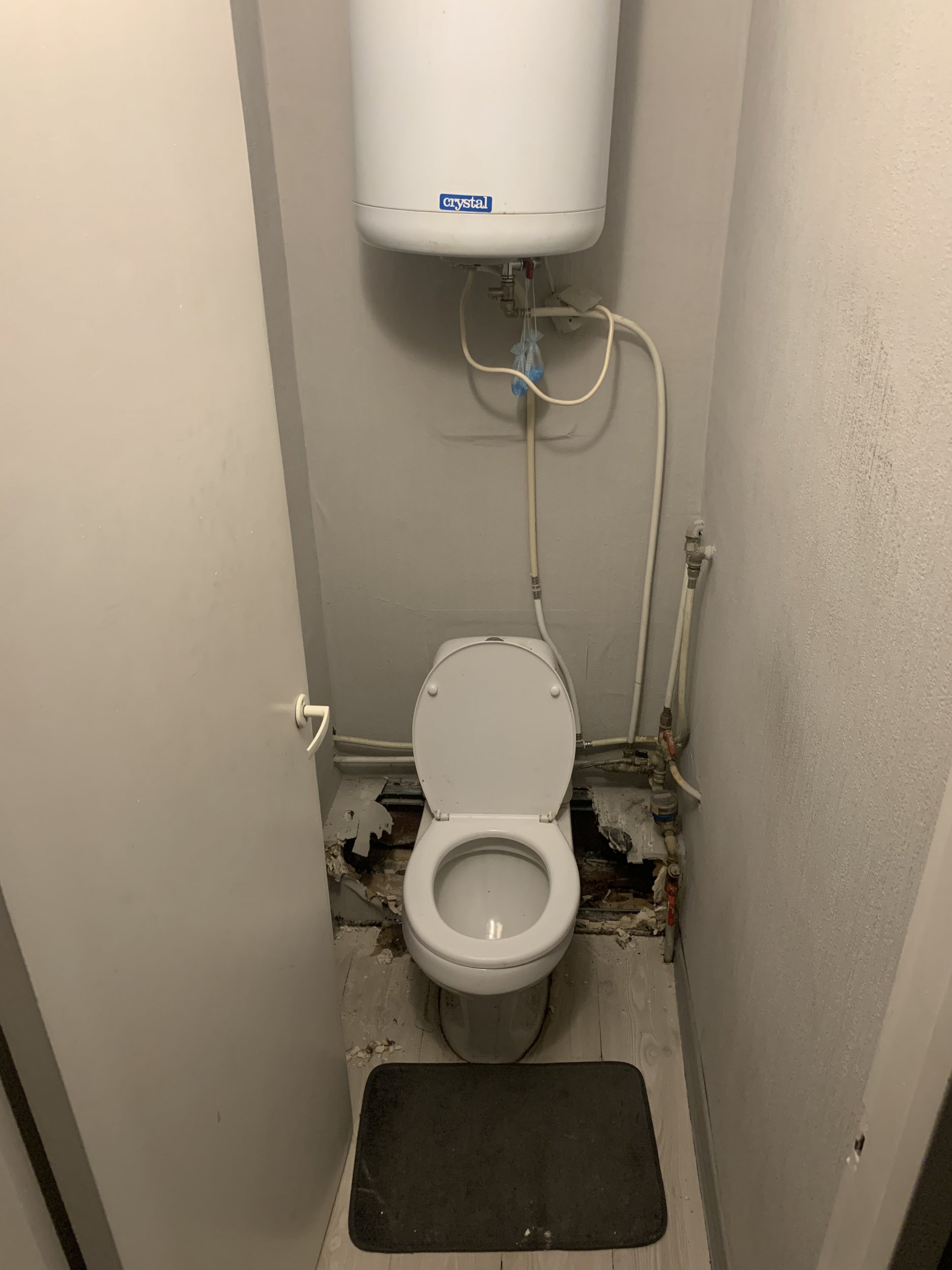 Aluspõranda vahetamine; põranda plaatimine; väljavoolutoru lekib, tuleb korda teha; külma ja sooja vee torude vahetamine, seina sisese wc poti paigaldus.
