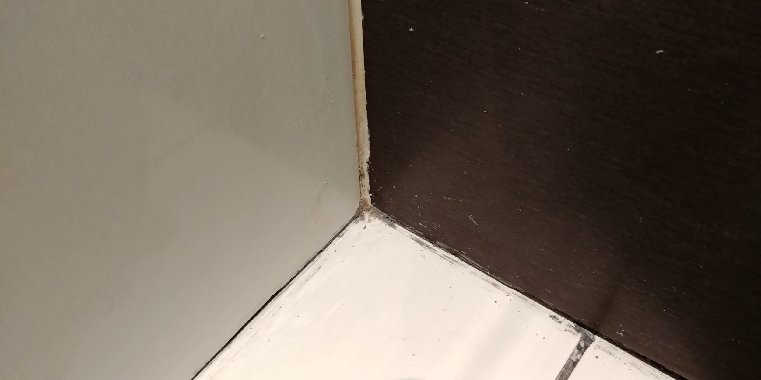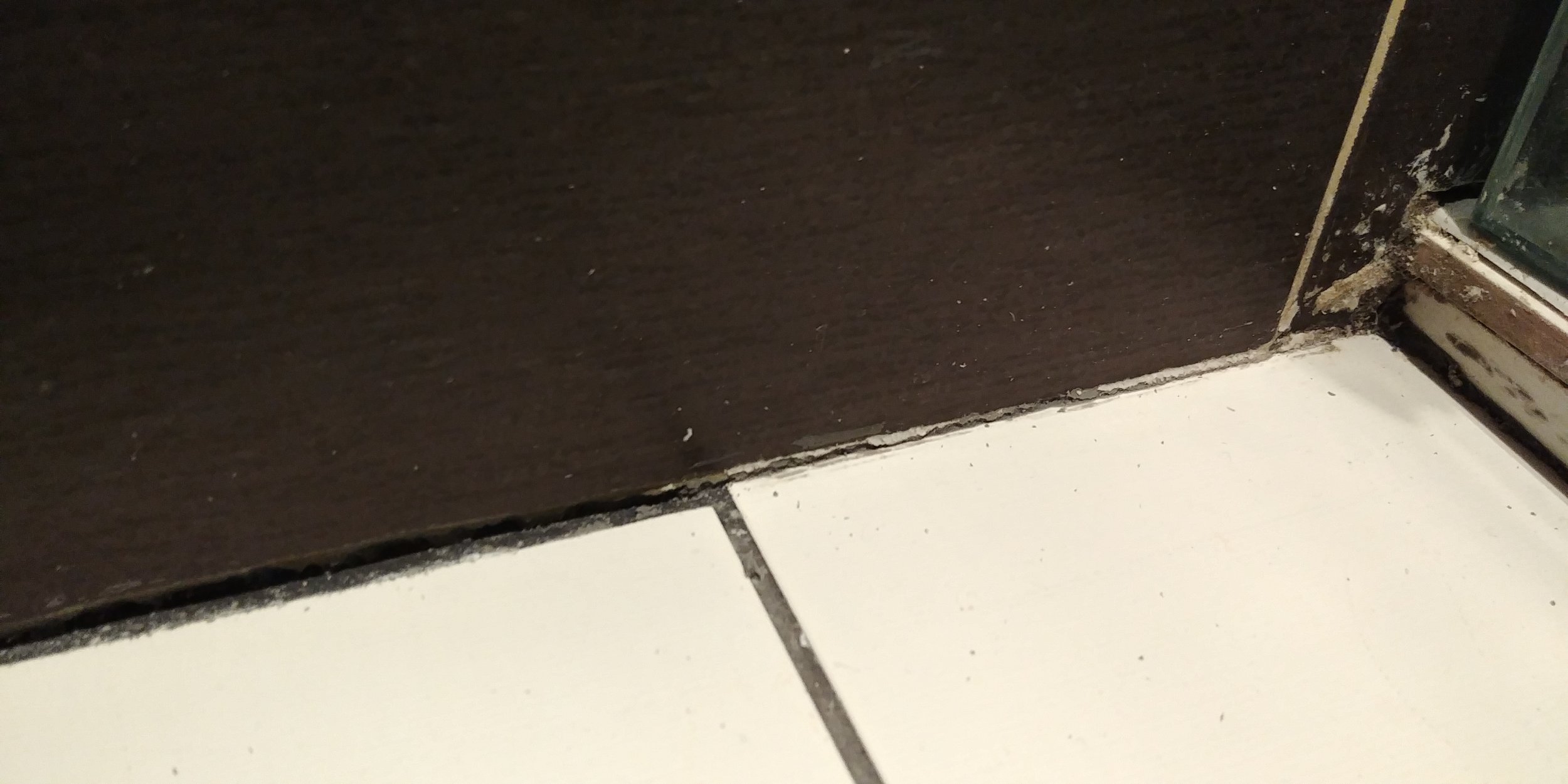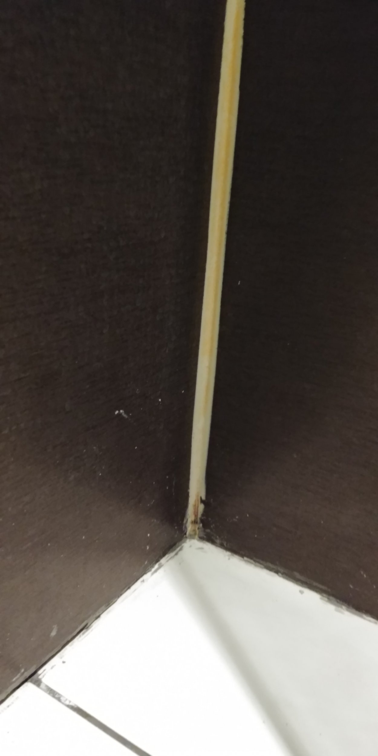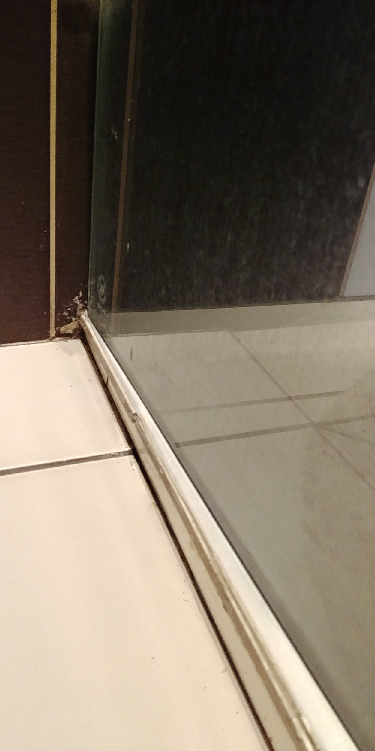 Silikoon on juba osaliselt ära võetud, aga peamise silikoonikihi all oli peidus veel alumine kiht, mis ulatub sügavale põranda- ja seinaplaadi vahele ning vajab samuti puhastamist/täitmist. Ðušinurk lekib klaasseina ja seina kokkupuutekohas (pilt nr 4).