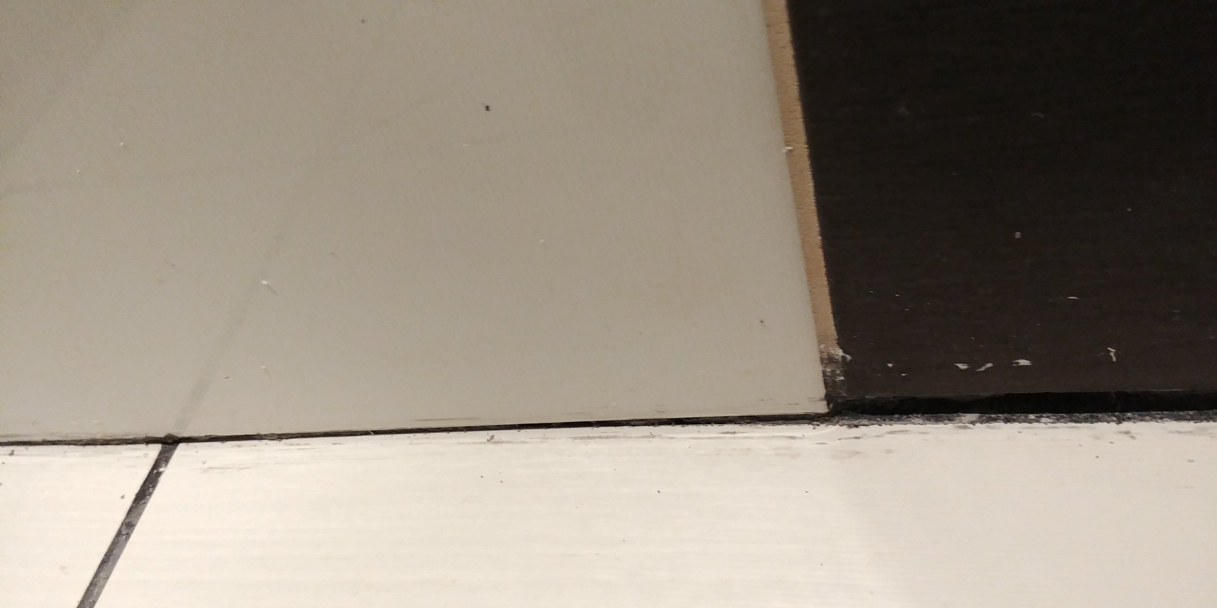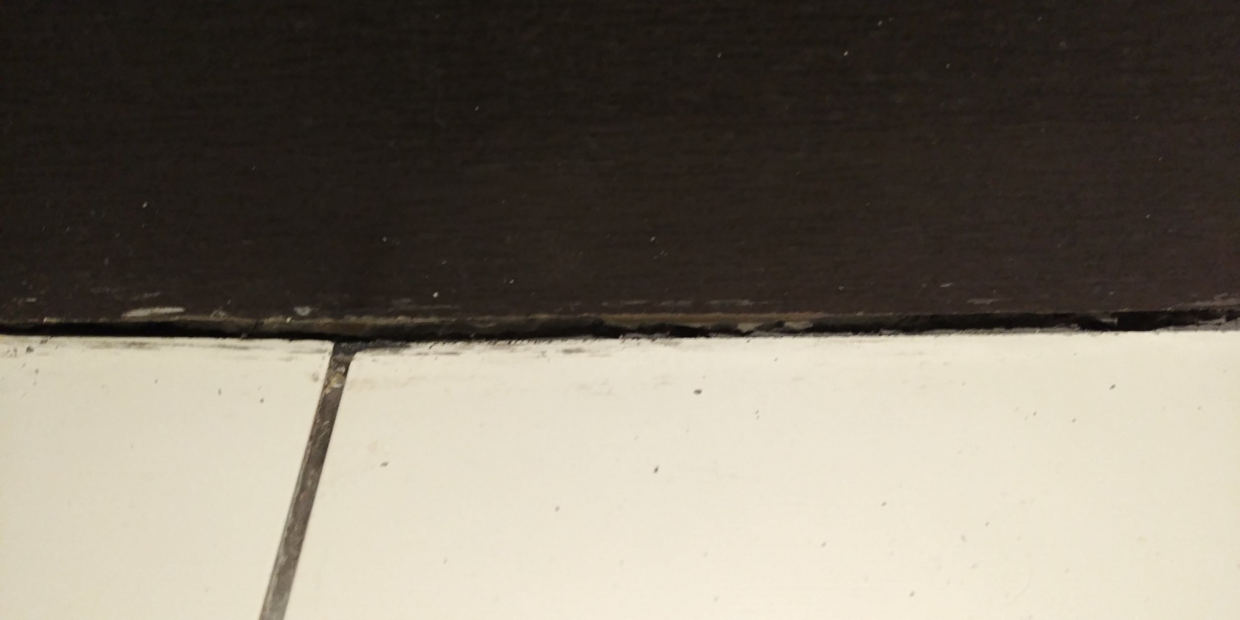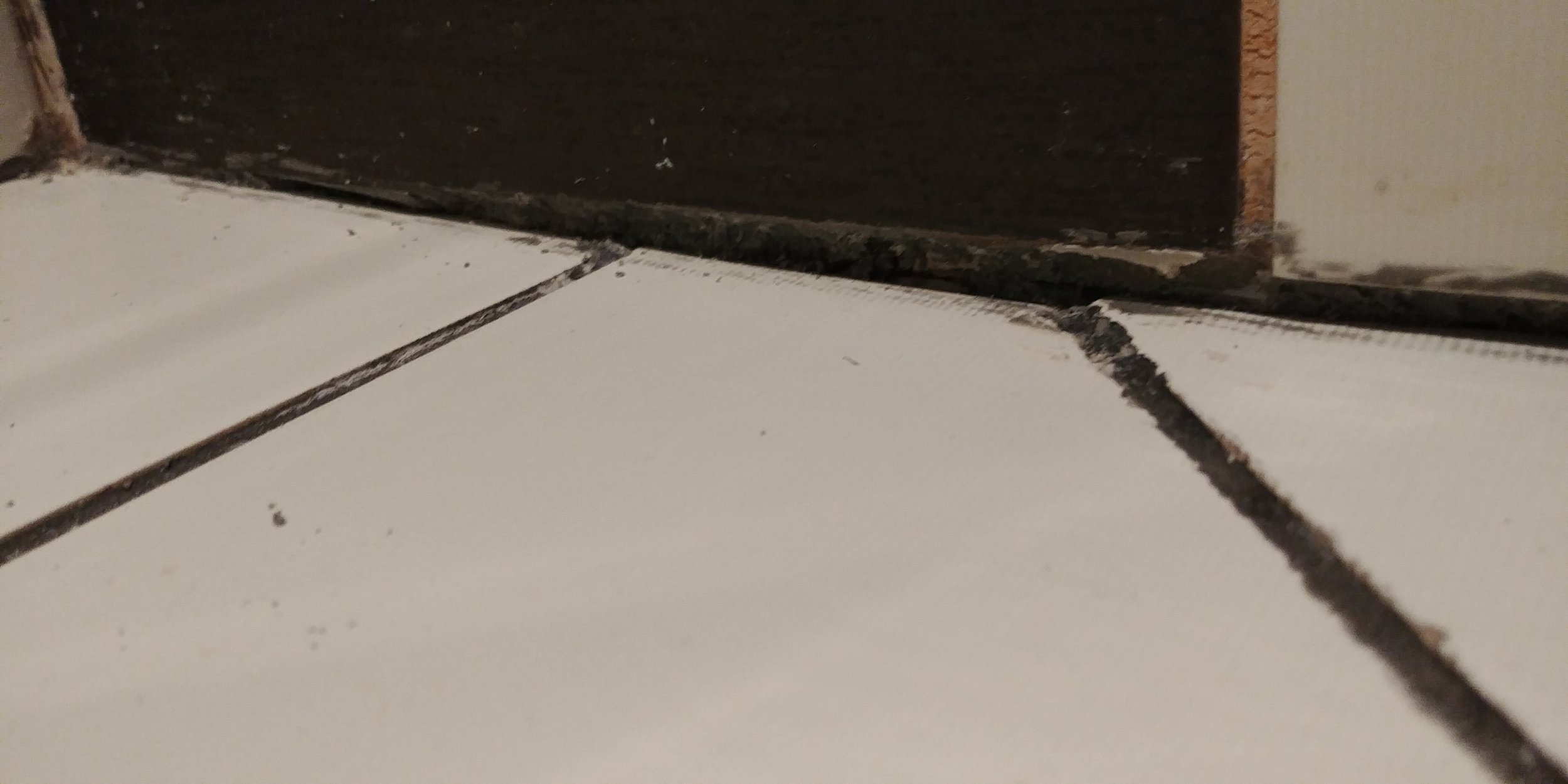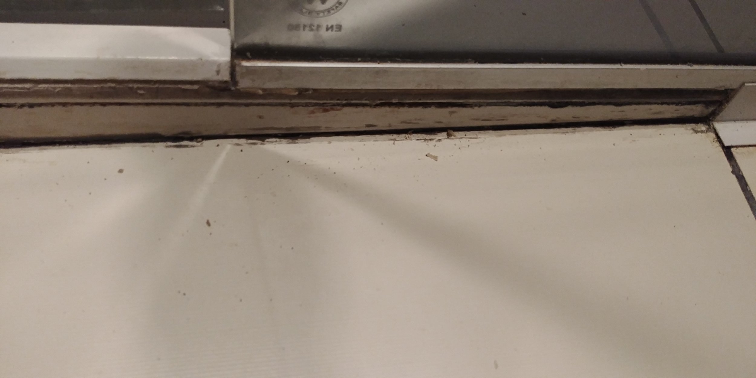 Silikoon on juba osaliselt ära võetud, aga peamise silikoonikihi all oli peidus veel alumine kiht, mis ulatub sügavale põranda- ja seinaplaadi vahele ning vajab samuti puhastamist/täitmist. Ðušinurk lekib klaasseina ja seina kokkupuutekohas (pilt nr 4).