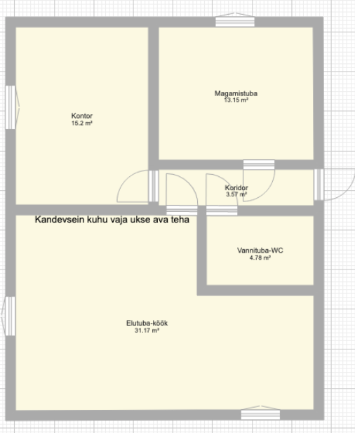 Korterist vaja lõhkuda umbes 2-3m pikk sein ja ehitada koridorist juurde vannituba. Sulgeda kaks ukseava ja vaja kandvasse seina teha uus ukseava avatud elutoa ja köögi jaoks.