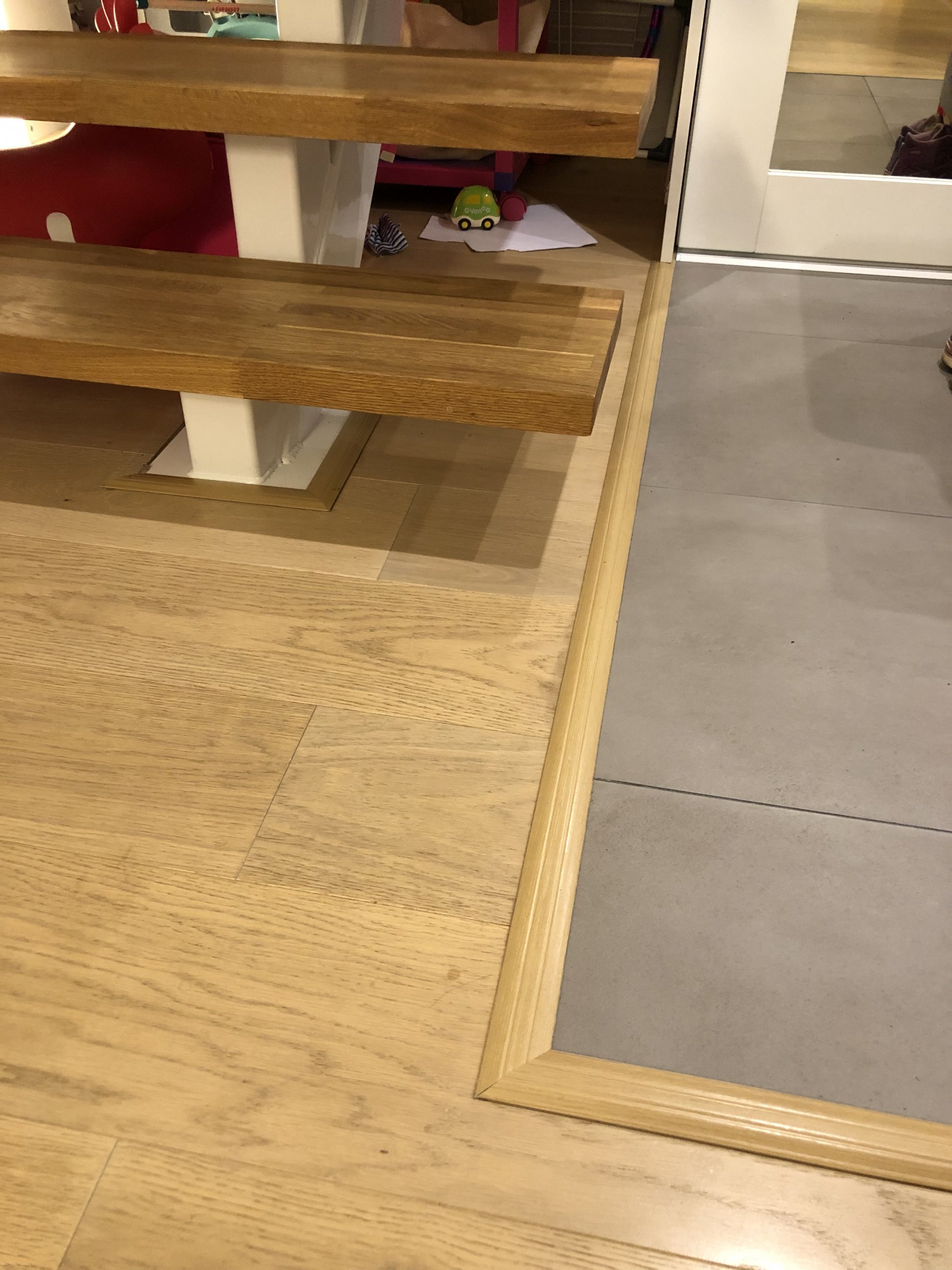 Kui parkett ja plaadid on sirgelt lõigatud ja paigaldatud, siis võiks teha ka pakkumise, kui viimistleda hoopis sama tooni vuugiga.