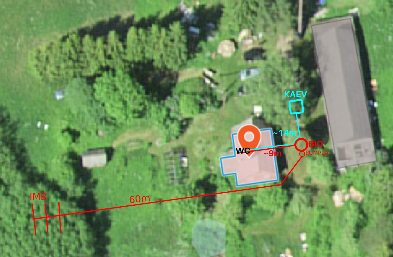 Biopuhasti võiks olla minimaalses mõõdus, ette nähtud püsivalt 1-2 elaniku jaoks. Kaevust majja trassi pikkus ca 10m, majast biopuhastisse ca 5m, biopuhasti pumplast imbsüsteemini ca 60m.