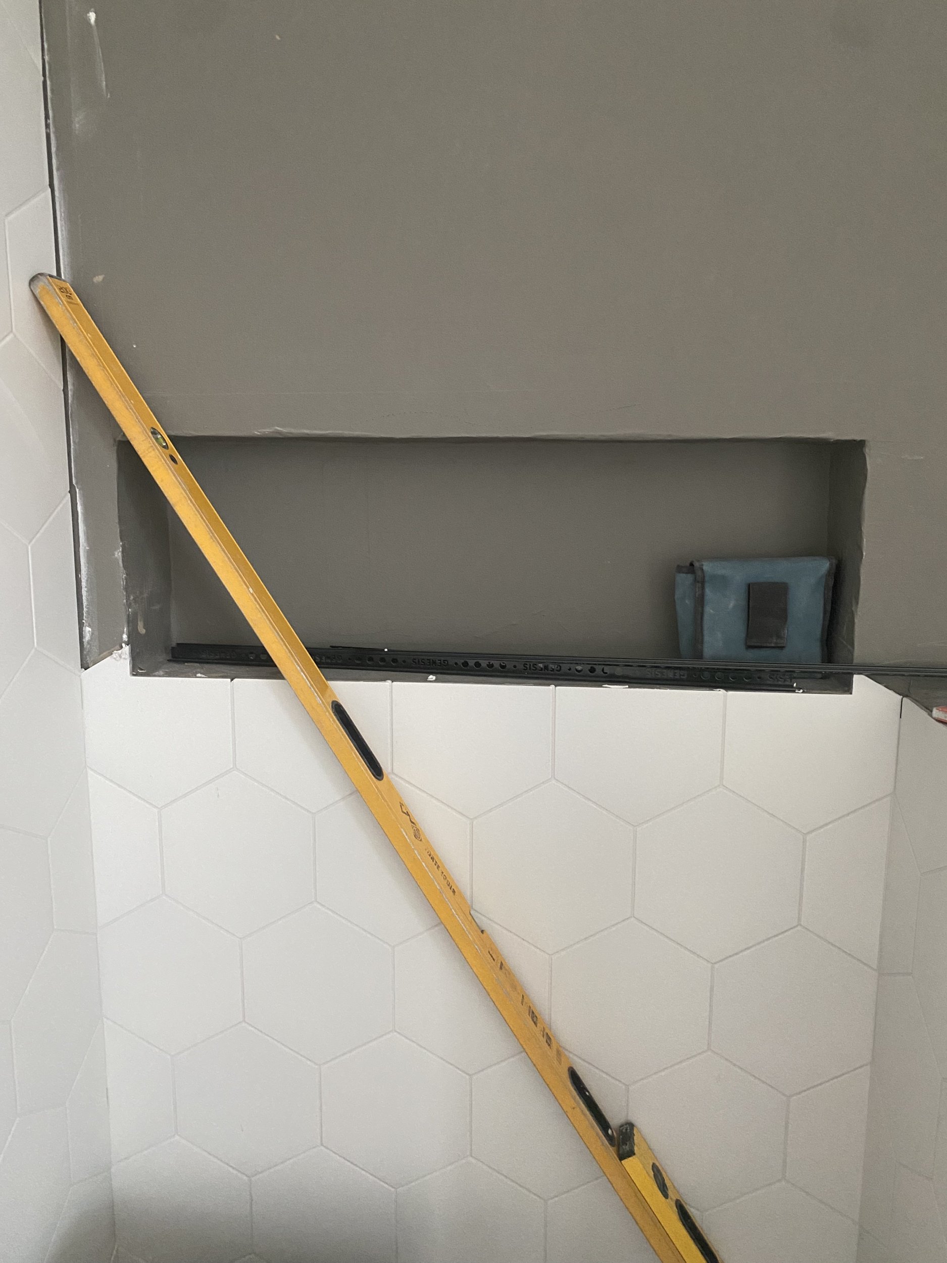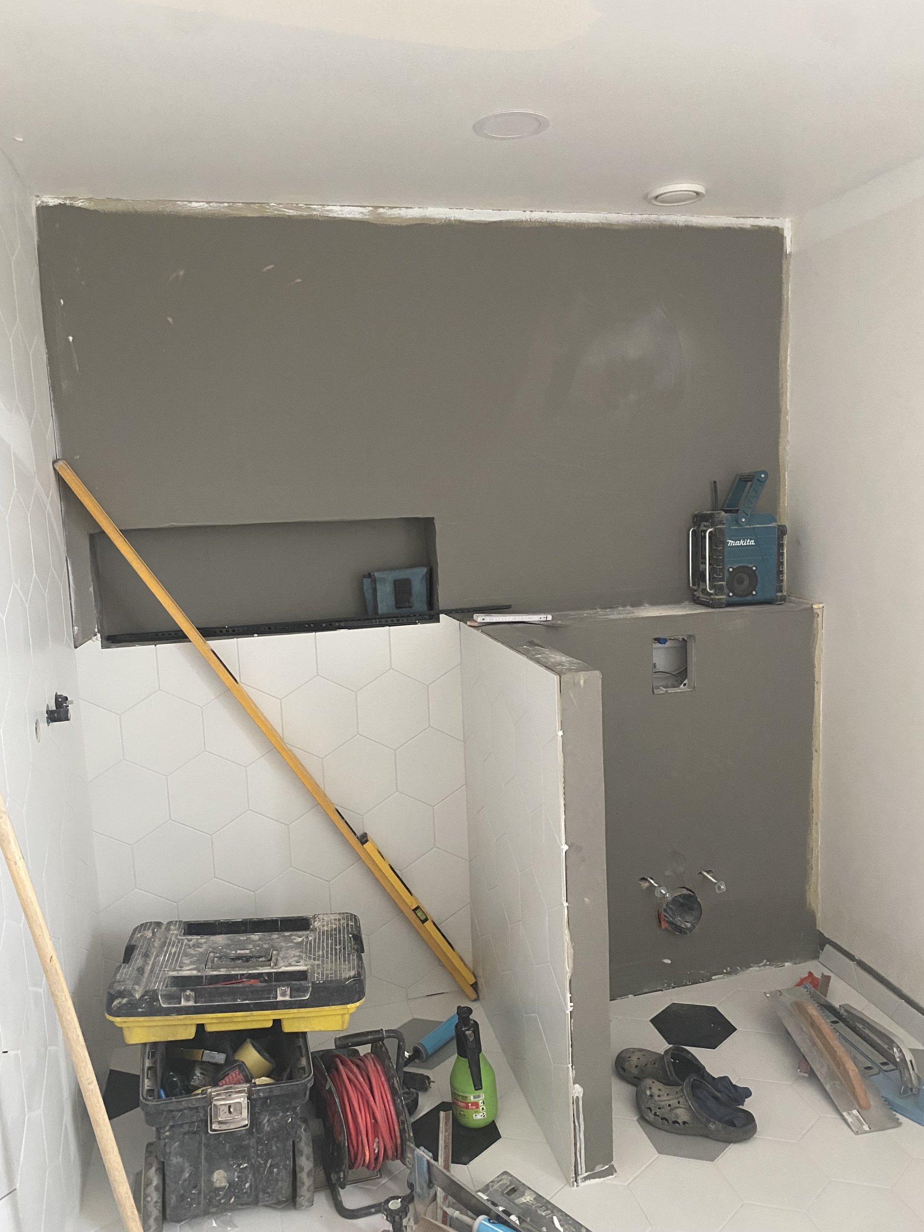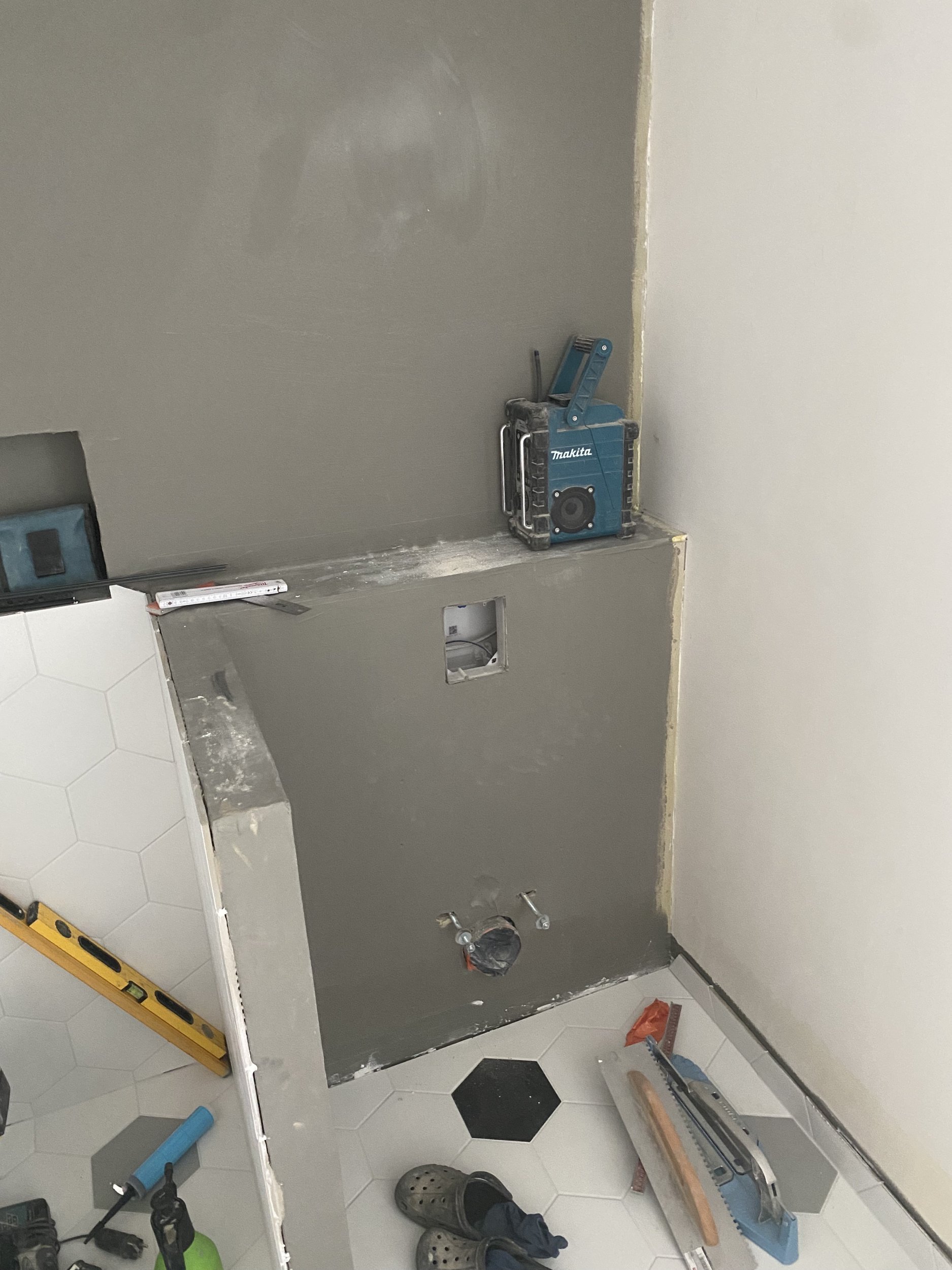 Ühes seinas on sisse peidetud riiul, vetsupotti ja dušši eraldav sein ning välja ulatuv sein kuna vetsupott on seina peal. (pilt)