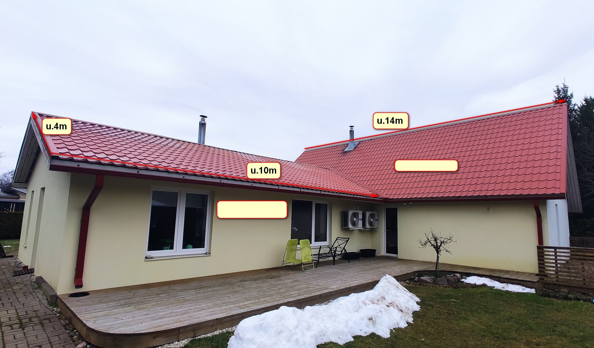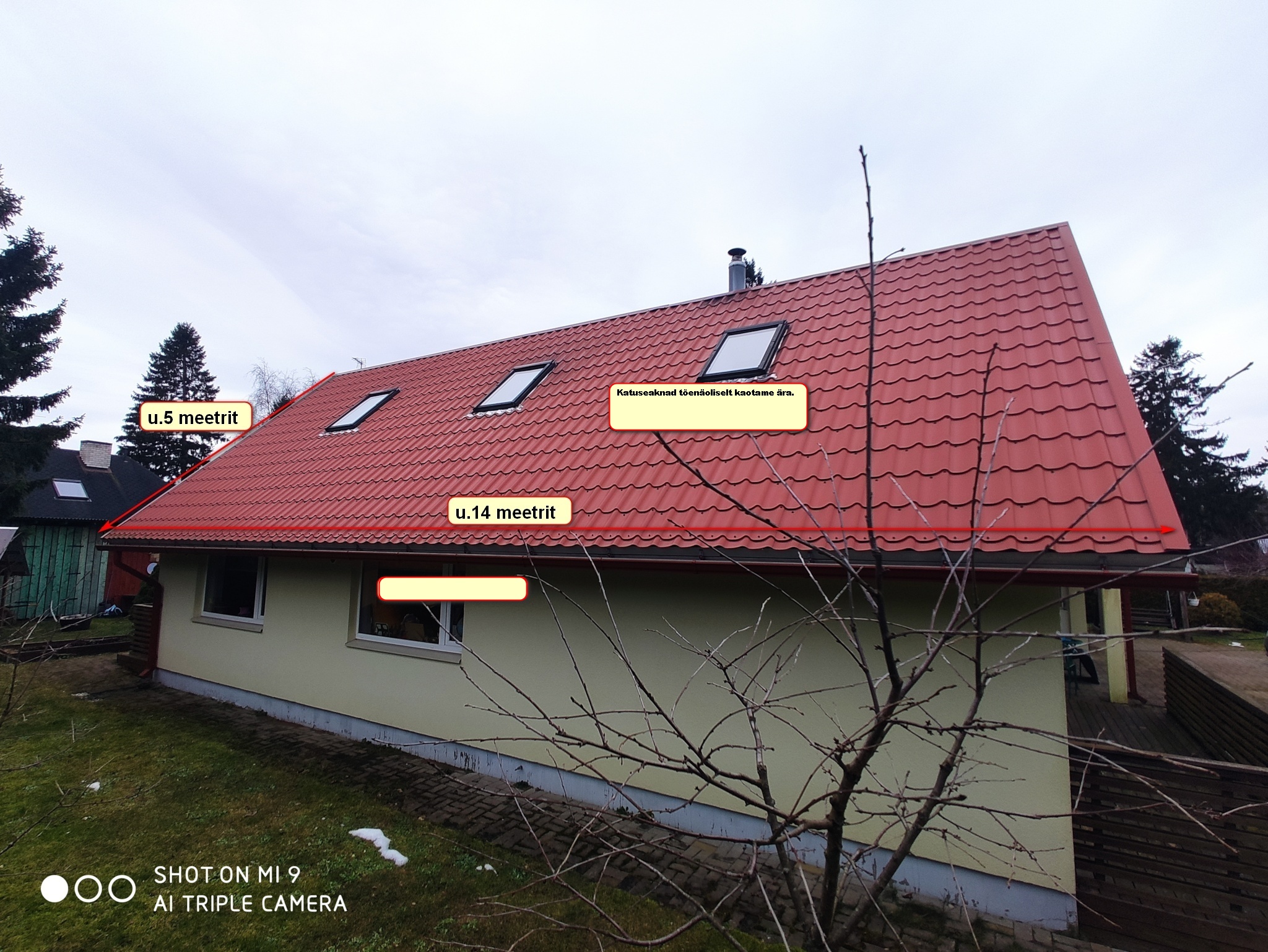 Variant 1 - Lisaks katusele siis ka kõik vajalikud lisad (käiguteed korstende juurde, vihmaveerennid/torud, jne...). Uus kattematerjal võiks olla musta värvi sile valtsplekk. Ilmselt tahab ka roov kohendamist. Sarikad ja selline üldine konstruktsioon, ma eeldaks, et on siiski OK. Lisaks oleks tööde teostaja poolt materjalid, olemasoleva eemaldamine ja utiliseerimine, jne... ehk siis selline "võtmed kätte". Mõõdud piltidel ja joonisel on üsna "umbes" aga siiski ligilähedased. Tuulekastid - kui võimalik siis integreerida vanad uue katusega ja värvida. Kui mitte, siis uued. Katuseaknad tõenäoliselt kaotame üldse ära katuse vahetuse käigus (või siis vahetame kvaliteetsemate vastu, oleneb rahanumbrist). See oleks siis variant 1 sellest projektist.