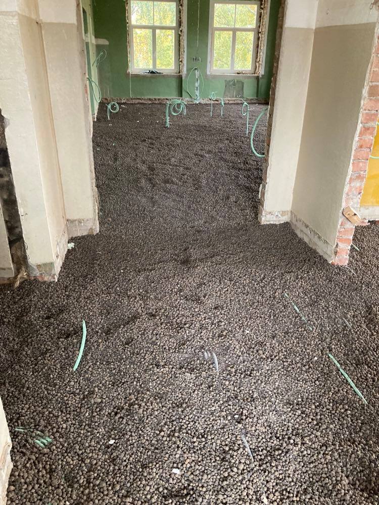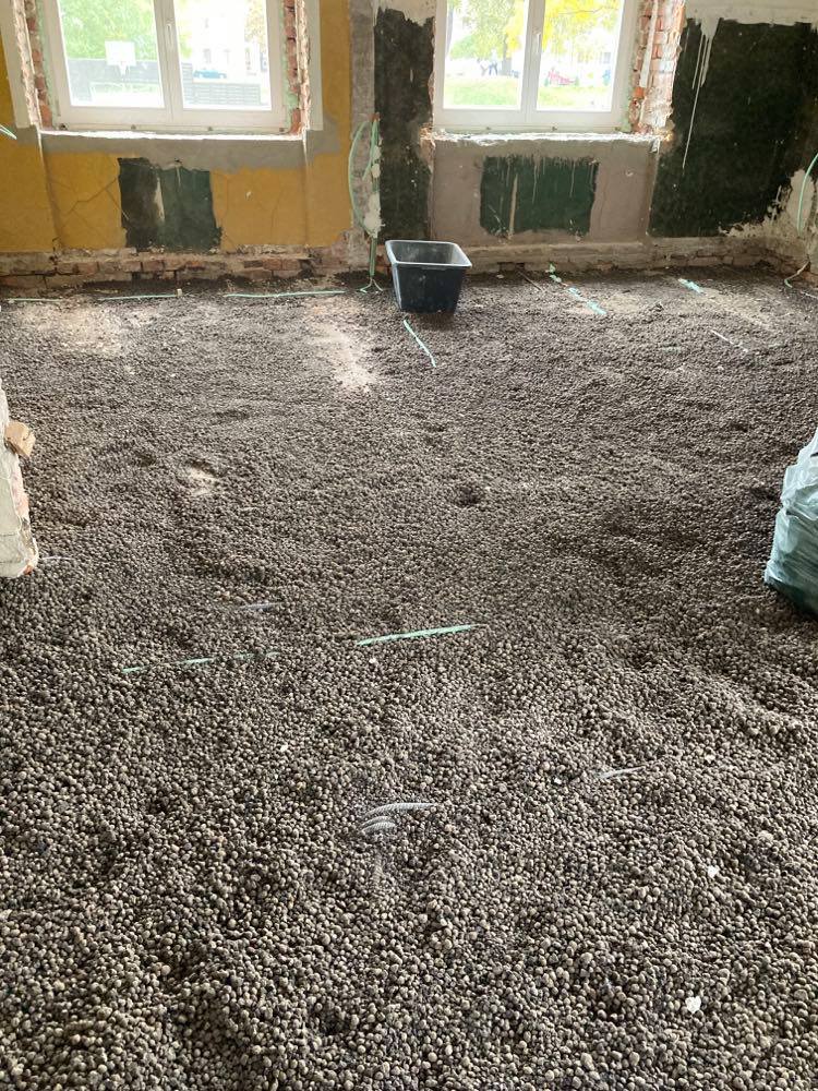 2 korrusel on täidetud fibo kruusaga, veidi on vaja siluda ning paigalda põranda vill 30mm ja armatuurvõrk. 166m2