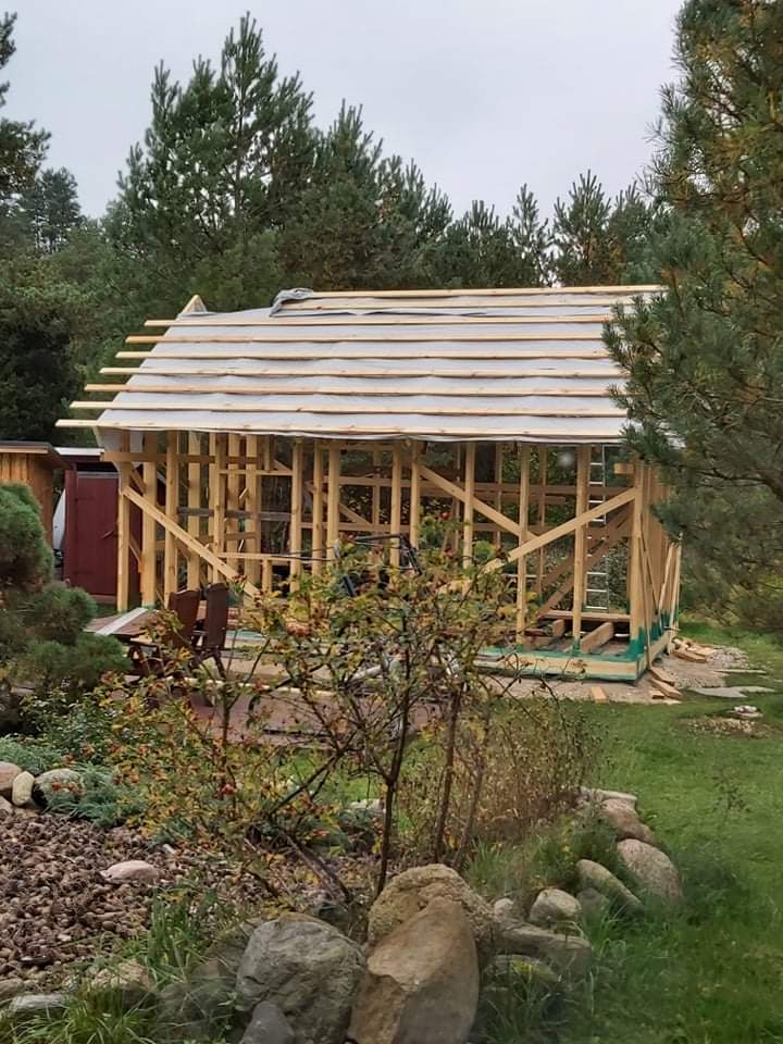 Viilkatusele katusepleki paigaldus, harjaplekk, servaplekid (koos alusprussidega). Katuse laius 7,20 m, pikkus katuseharjast 3,15m (x2). Trapetsplekk RR32 (tumepruun)