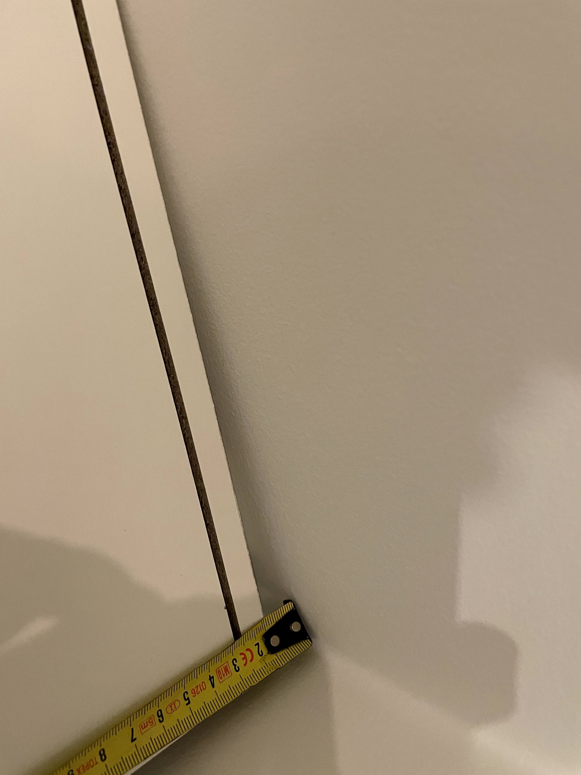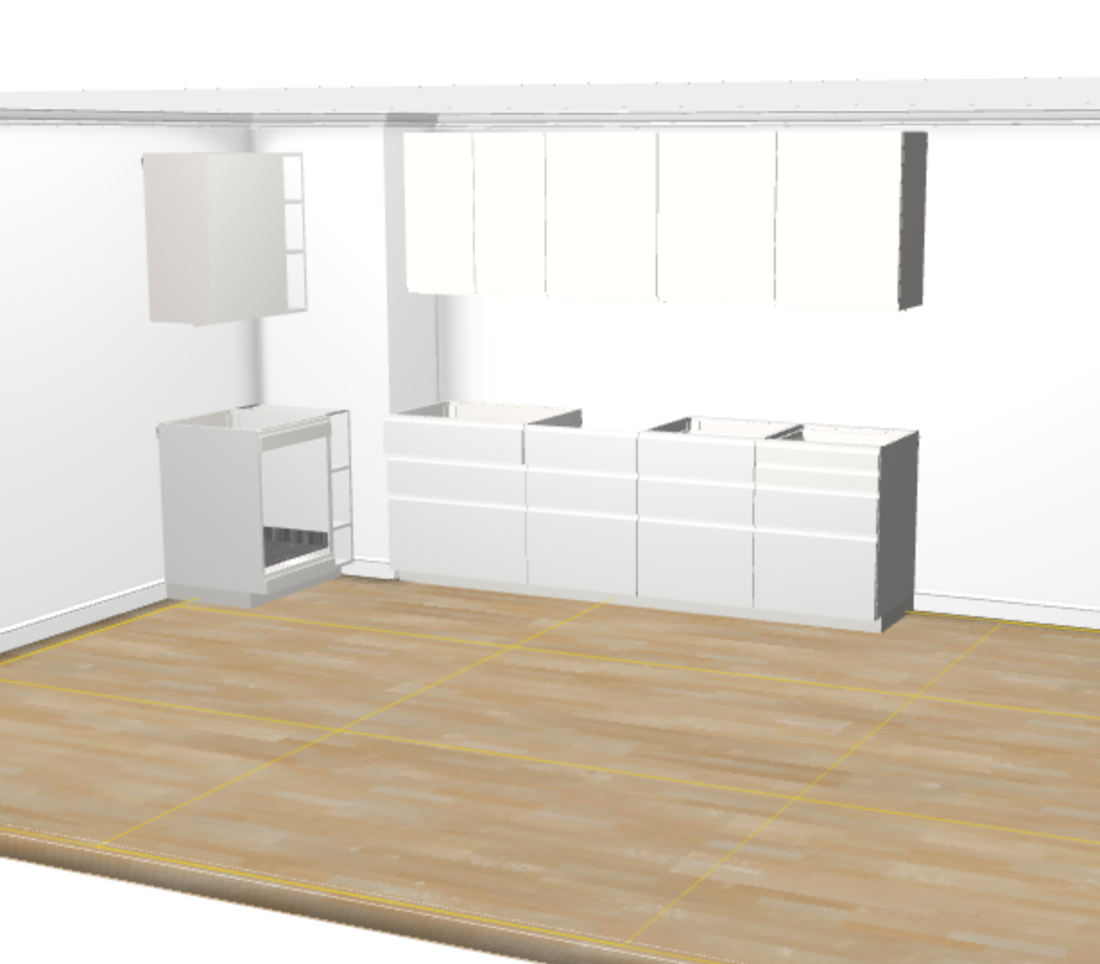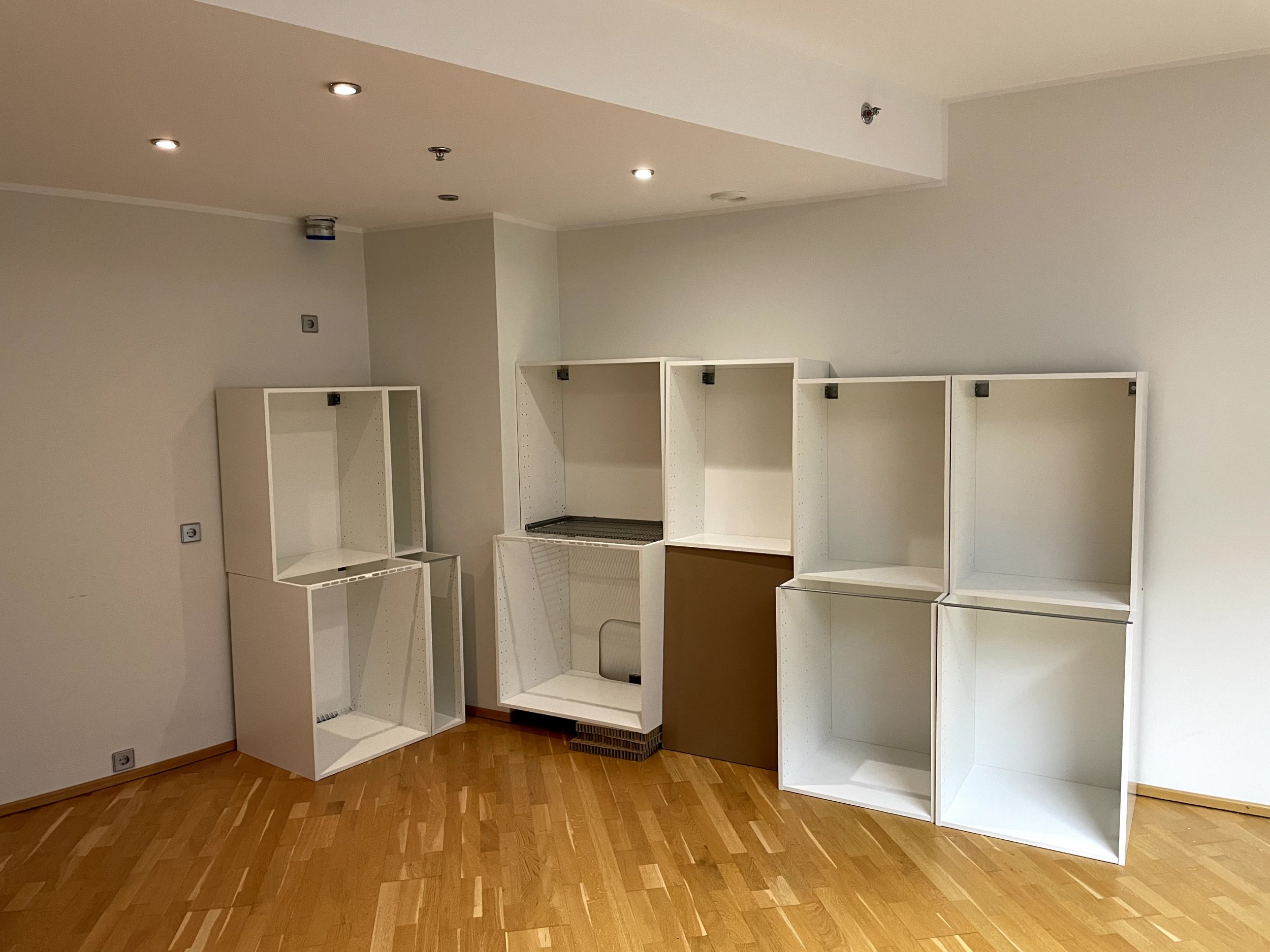 Köök läheb kahte seina, nurgas on kommunaalide kast. Üks sein on planeeringu järgi ümar, aga kuna sinna läheb ainult 20+80cm asju, siis jääb umbes 1cm jagu kumerust võrreldes sirge seinaga.