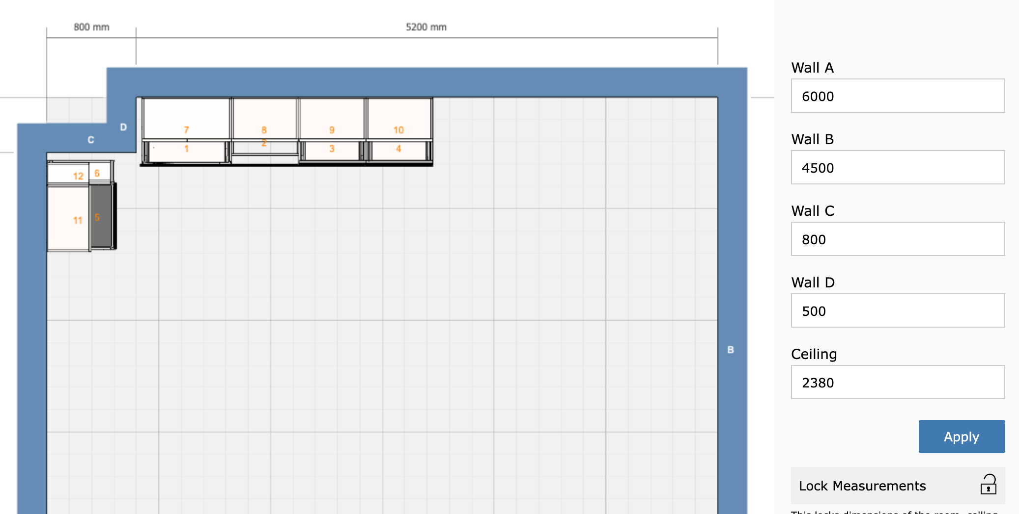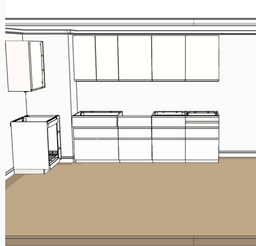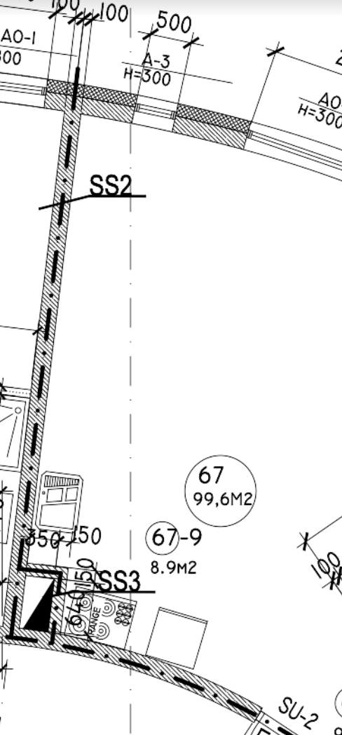 Köök läheb kahte seina, nurgas on kommunaalide kast. Üks sein on planeeringu järgi ümar, aga kuna sinna läheb ainult 20+80cm asju, siis jääb umbes 1cm jagu kumerust võrreldes sirge seinaga.
