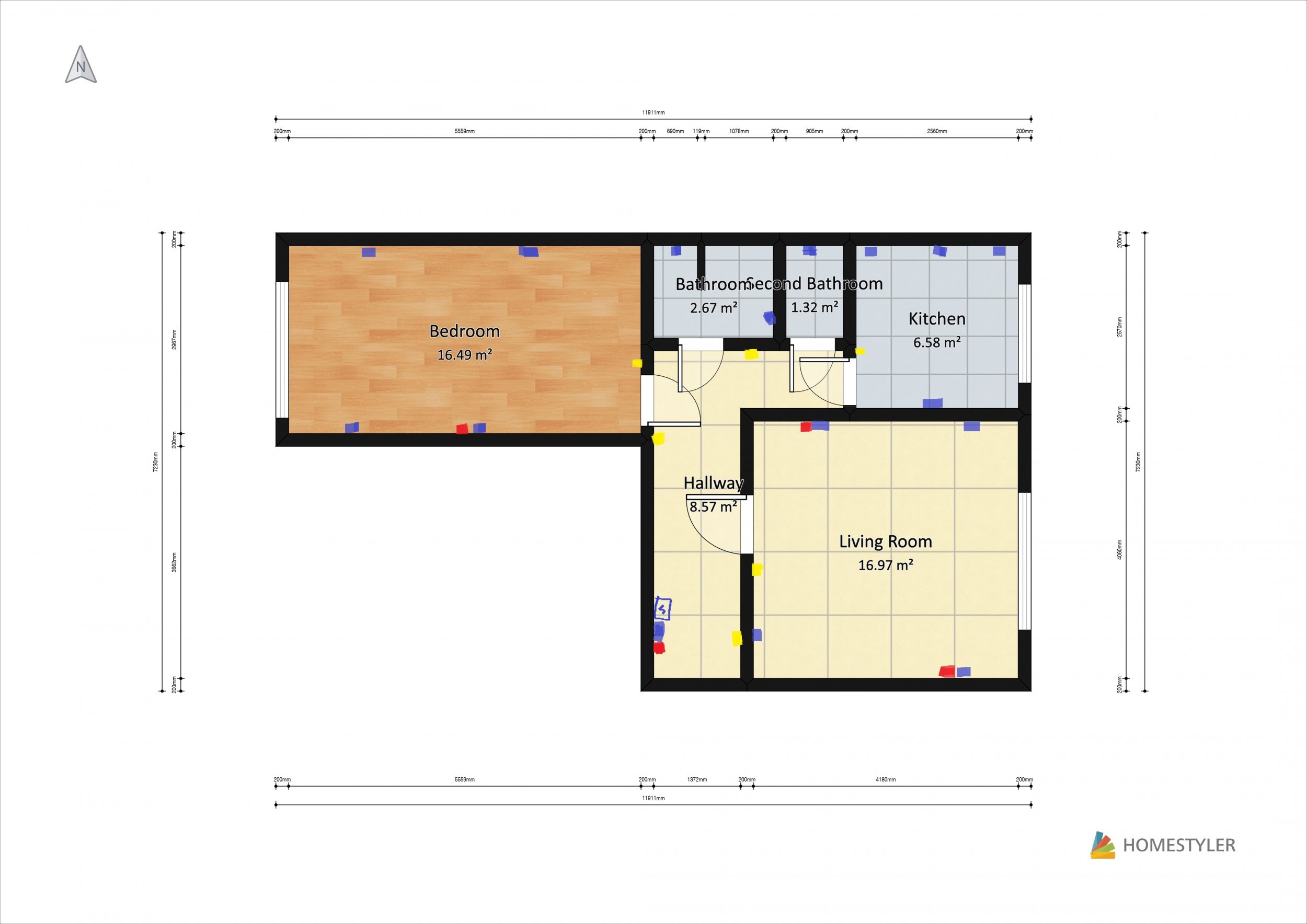 Pildidil on ka umbkaudne korteri plaan. Punasega märgitud arvutivõrgu asukohad; sinisega märgitud pistikupesad ja kollasega valgustite lülitid. Esikus ja vannitoas tuleb kips lagi, seega sealt peaks saama suurema osa kaableid vedada. Tubades ei tule kipsi seina ega lakke seega peab seal kaablid seina sisse freesima (Peaks olema telliskivi sein, betoonist lagi). köögi ja elutoa vahel on vanad sissehitatud kapid (plaanile jäid märkimata), kust saab ka kaableid vedada, kui vaja. Freesitud kohad tuleb hiljem täita, kuid viimistlustöid ei soovi. Pakkumise võib teha nii ilma kui ka koos lülitite/pistikutega (palun ka märkida pakkumises tootja). Lülitid/pistikud tulevad musta värvi.