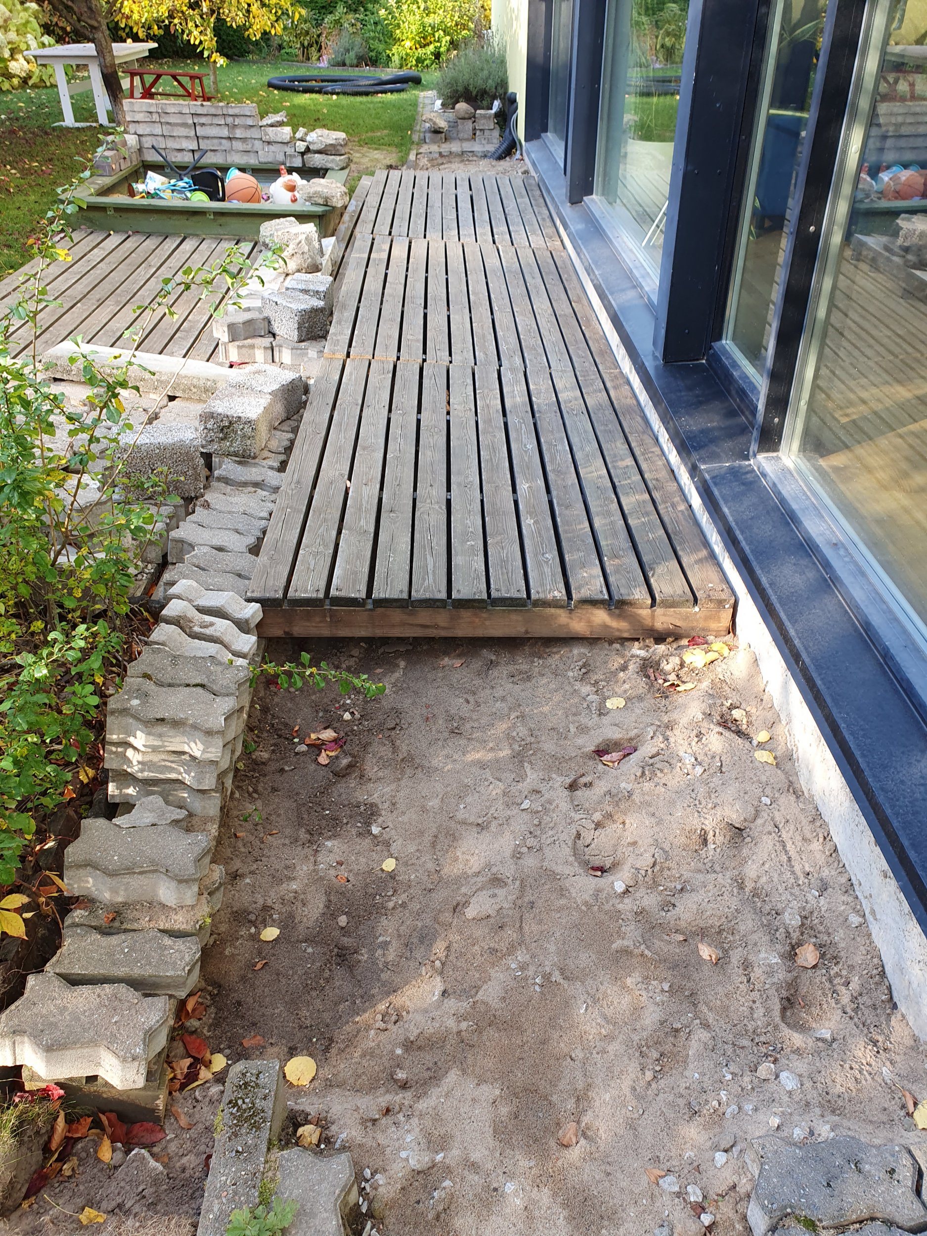On vaja taastada unikiviga kõnntiteed ja puuterrassi asemel paigaldada bordüüriga ka unikivi. Veel on vaja teha trepiaste rõduukse ees (unikivist, betoonist või mingi parema lahendusega). Umbkaugne töö on 30 ruutmeetri. Asukoht - Kakumäe, Tallinn. Unikivi ja bordüürid ei ole ostetud. Vana terrass on vaja ära viia.