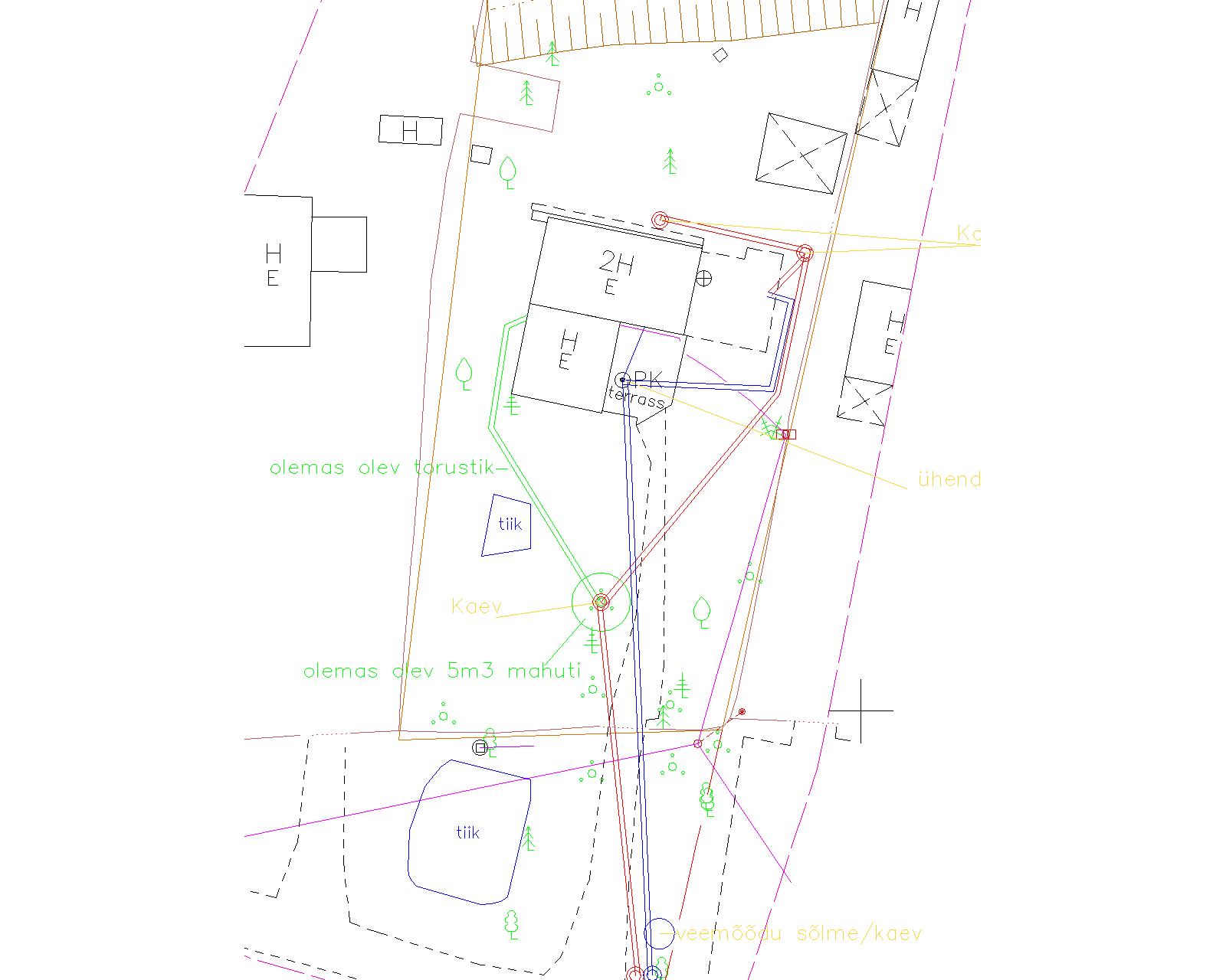 Kinnistul on hetkel 5m3 kogumismahuti, mille peaks tööde käigus eemaldama. Hetkel üks äravool on suunatud maja taha (tuleks ühendada olemasolevaga (lisada kaev?), Hoone põhi äravool maja küljelt mahutisse (mahuti asemele kaev? Kuhu toristikud kokku jooksevad)