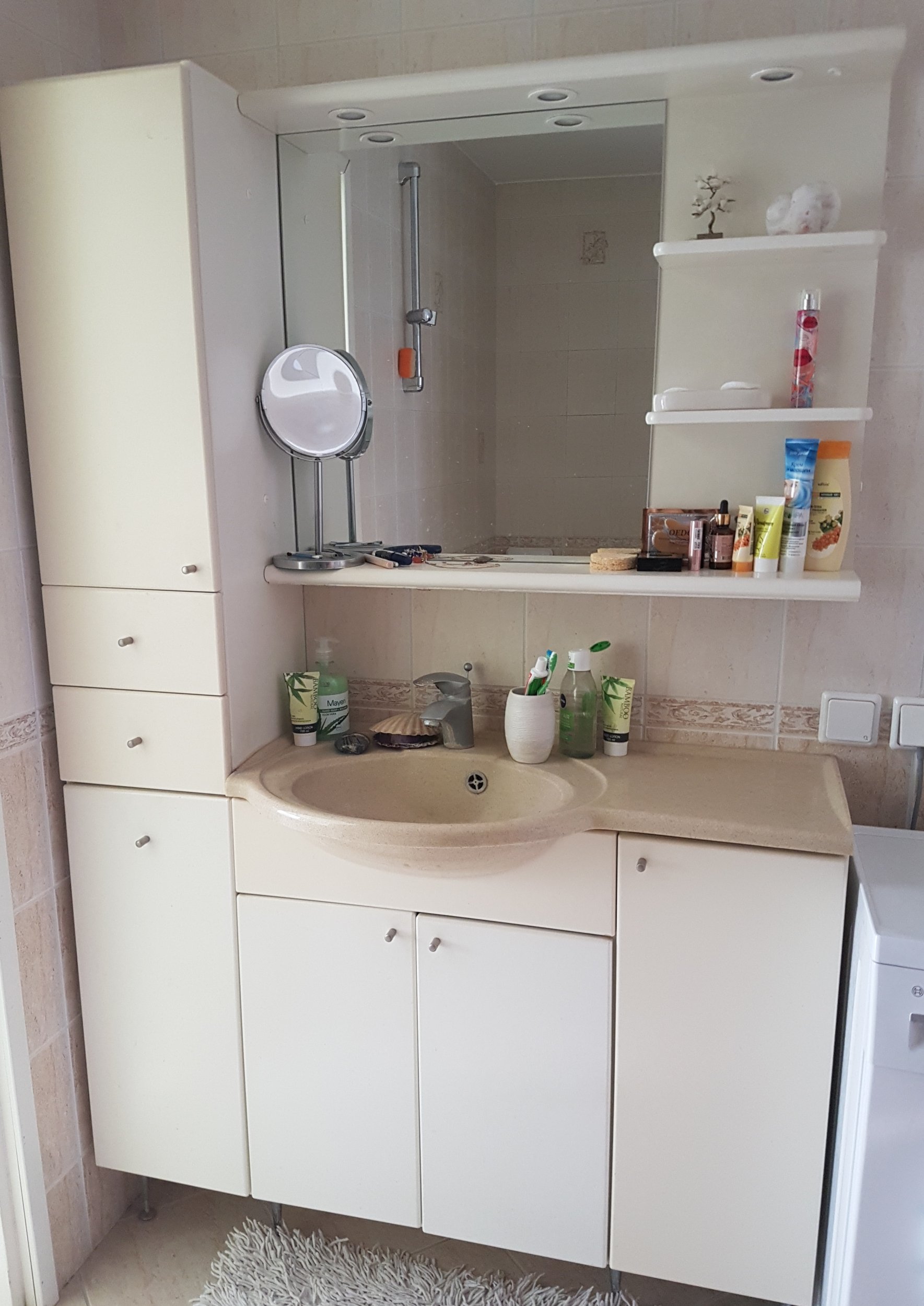 Kapiuksed kohendada ja värvida, segisti vahetada, kapi valgustus korrigeerida (vb peegli asemel panna peegeluksega ja LED-valgustusega uus kapp ja riiul). Balteko vannitoamööbel, vanust ei oska öelda, pakun, et aastast 1999. Üldiselt heas korras.