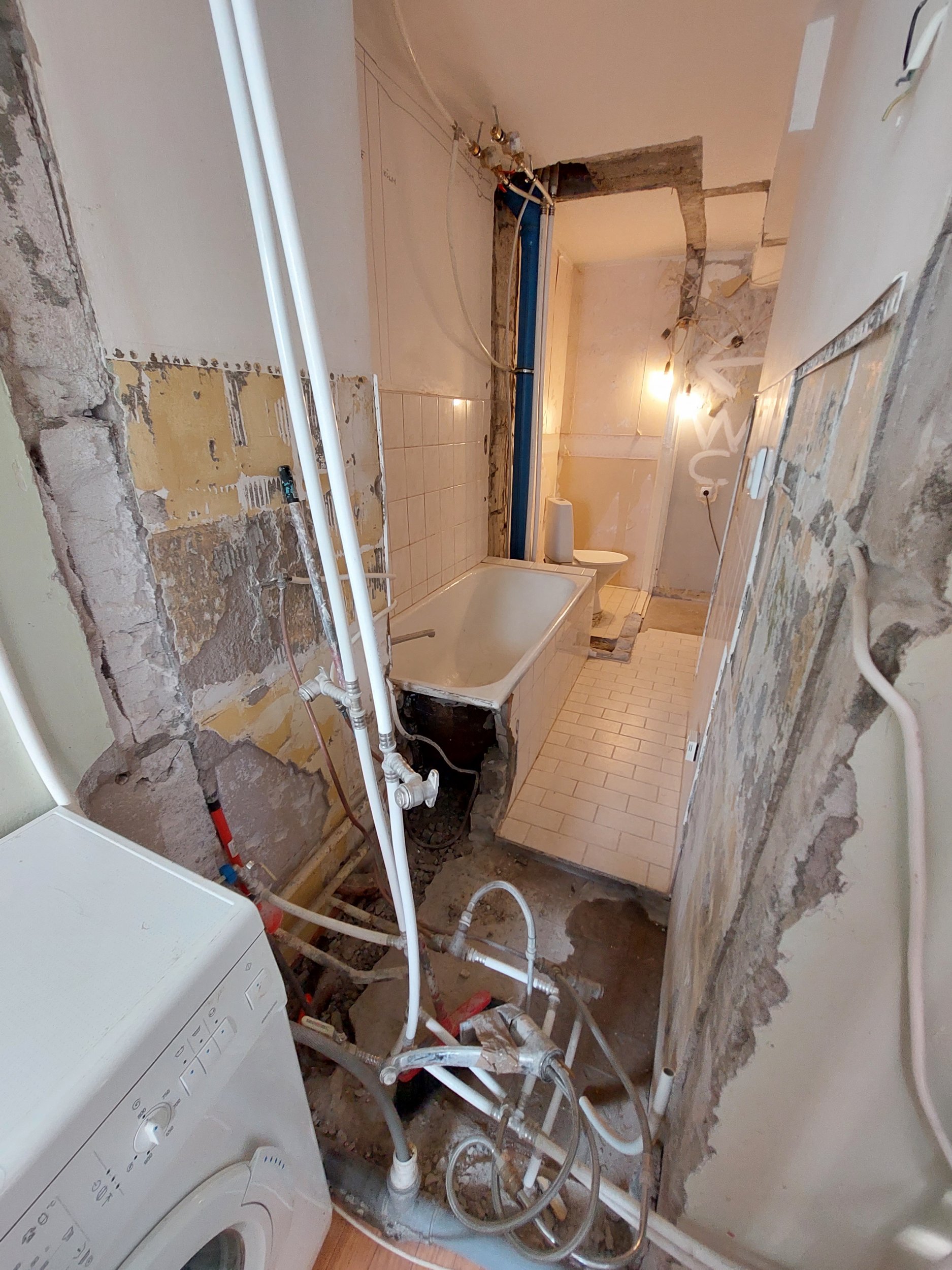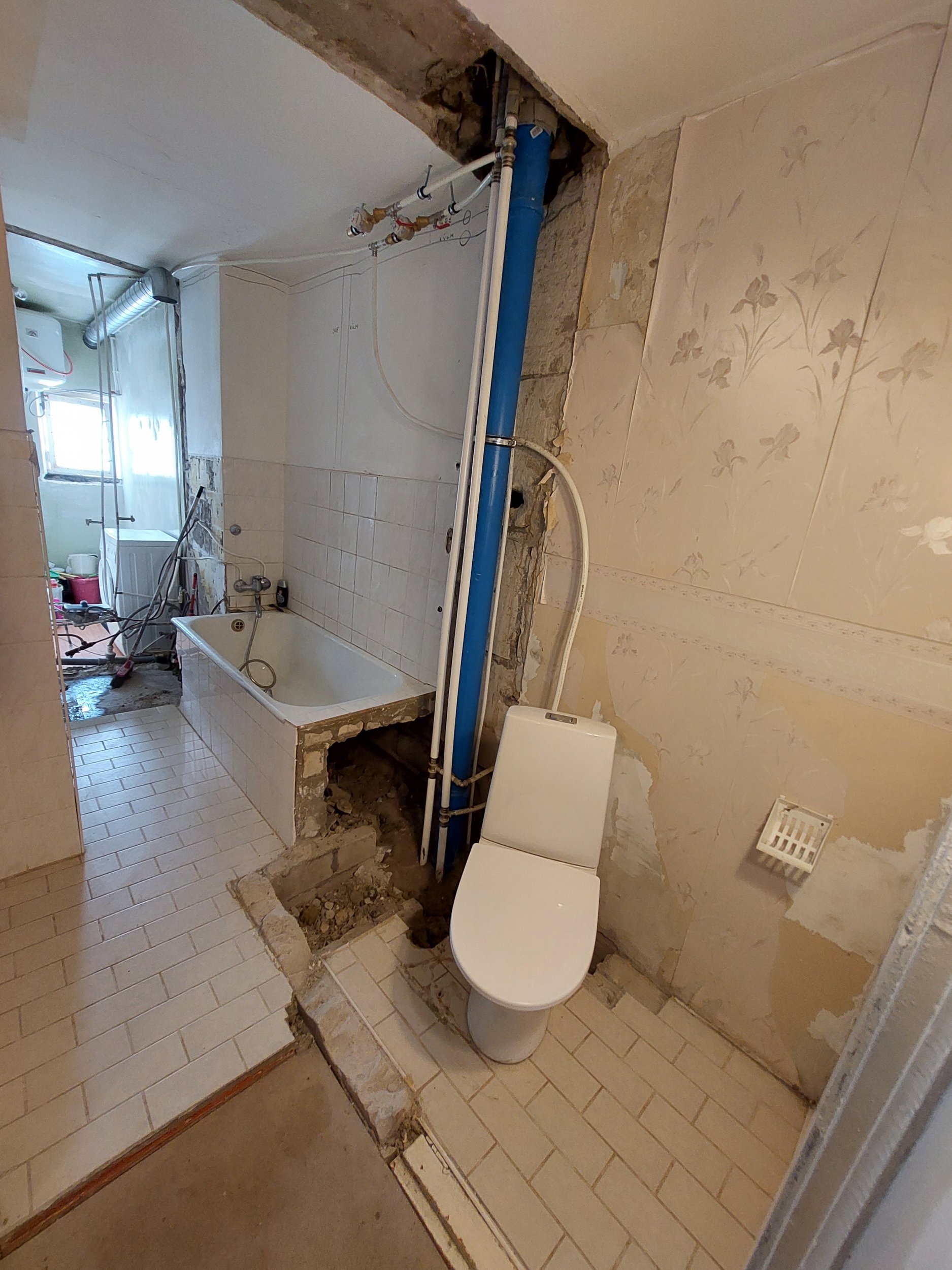 Hetke olukord: lammutatud vana püstik, sahvri ja vannitoa vaheline sein. Püstikus on uued torud (ka ventilatsioon). Põrand osaliselt lahti lammutatud. Osaliselt seinas vanu plaate eemaldatud. Demonteeritud vanad uksed.