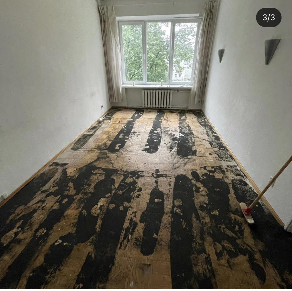 Korteris vana parketi eemaldus ja utilisatsioon. Kogu pinda on 45 ruutmeetrit.