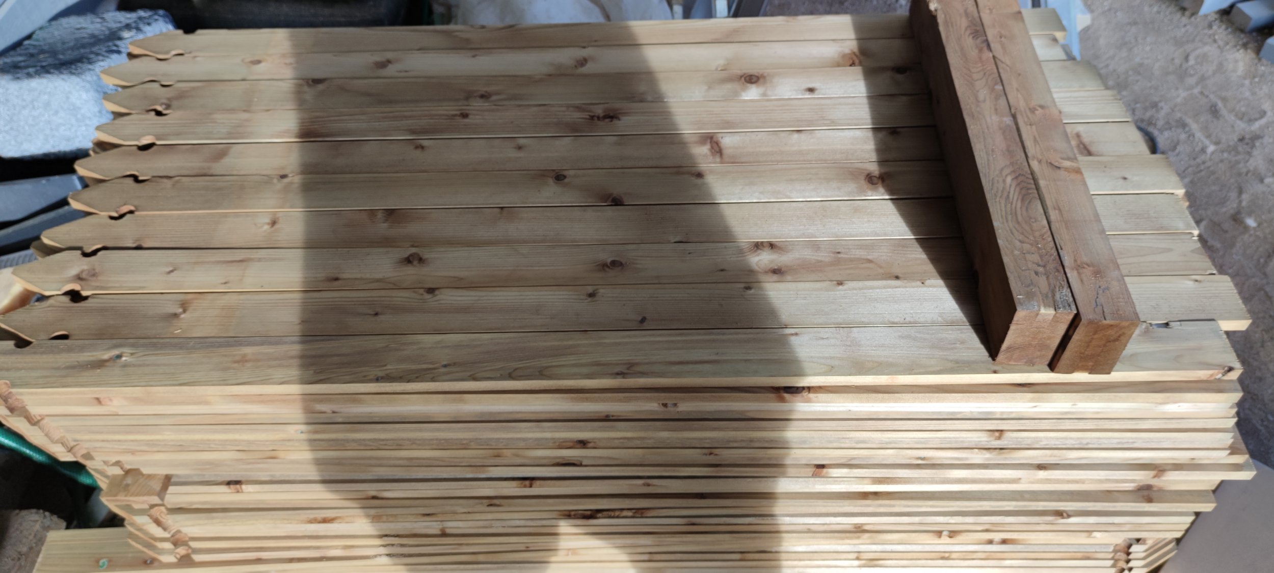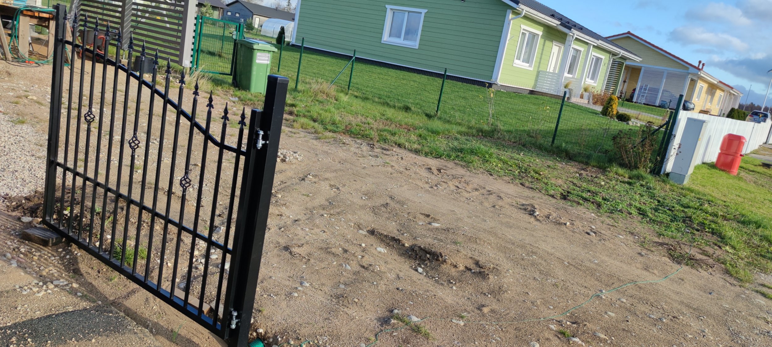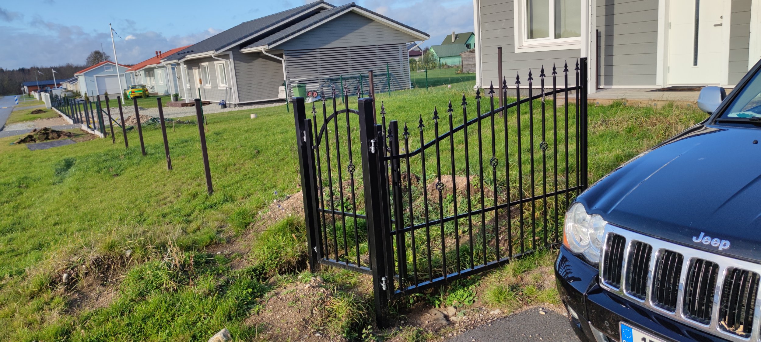 On vaja lõpetada aed. Jalg ja autovärav on paigaldatud. Olemas on paigaldamata aia postid ja lipid (immutatud). Puudu on 3 posti augud ja ristlatid aialippide paigalduseks (võivad olla tavalised sobivad prussid). Teravatipulised aialipid tuleb paigialdada sarnase kaaruga nagu autovärav (vt pilte). Lipikutega aia osa pikkus ca 25 m.