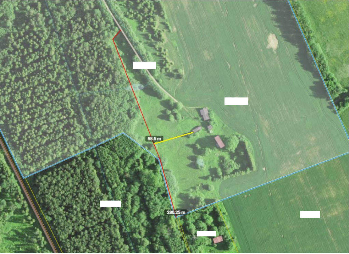 Teel on lähim punkt on 90 kraadise nurga all lähimast hoonest teenindaval krundil 55.5 meetri kaugusel