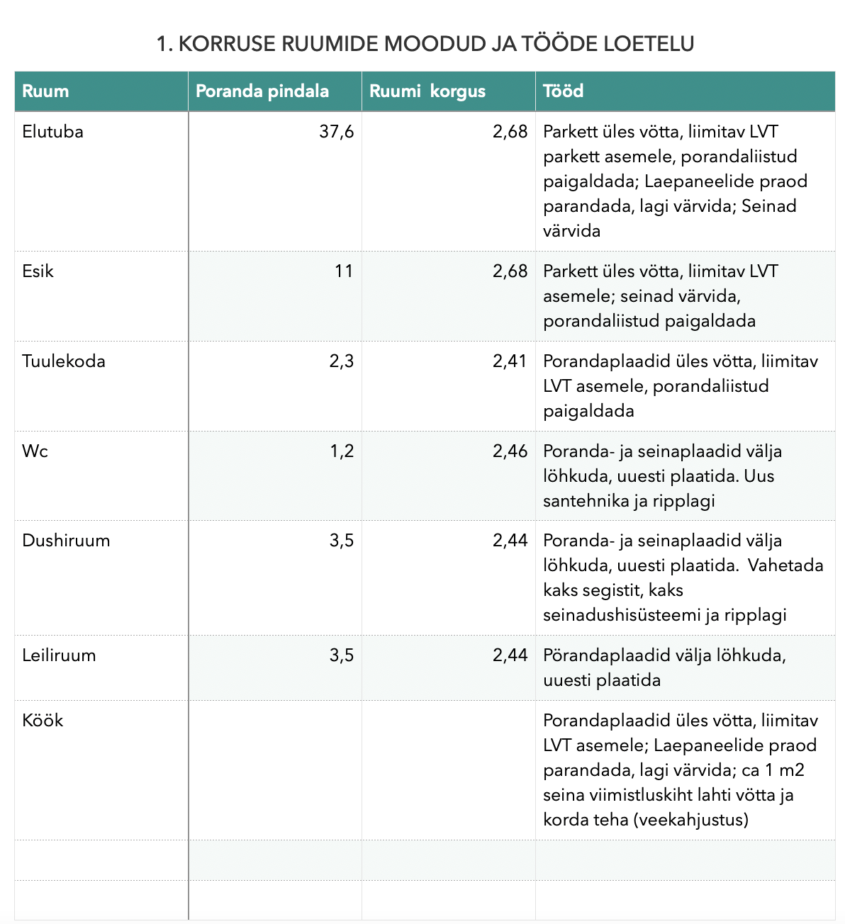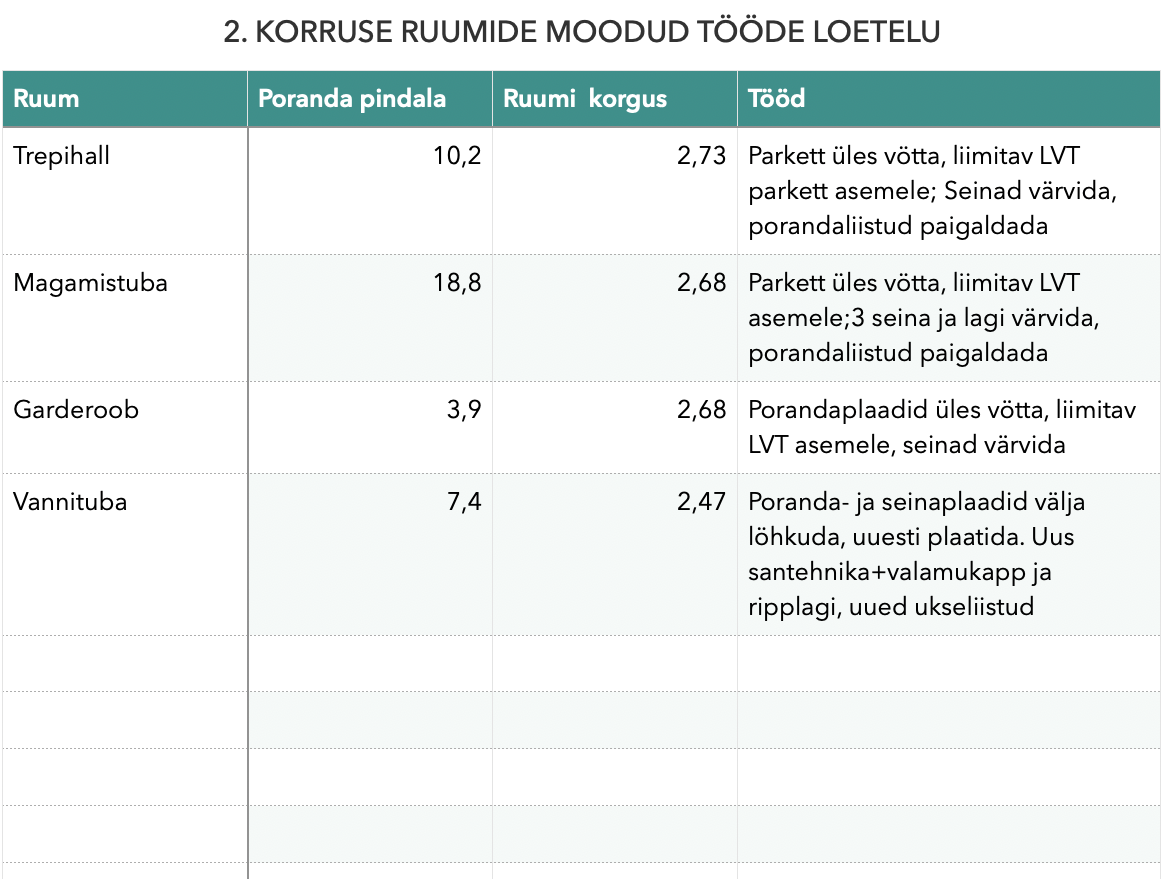1. esimese korruse ja osaliselt ka teise korruse parketi vahetus, seinte värvimine ja lagede värvimine