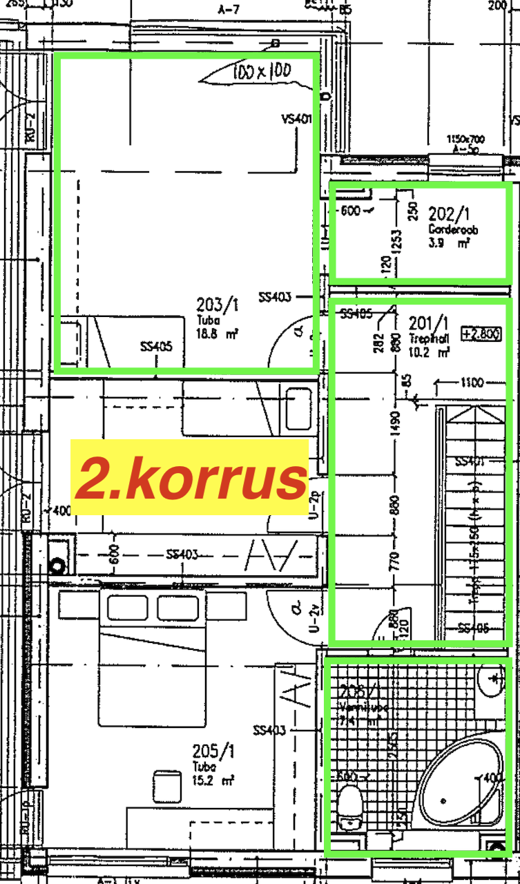 Teise korruse remonti vajavad ruumid on tähistatud roheliste joontega.