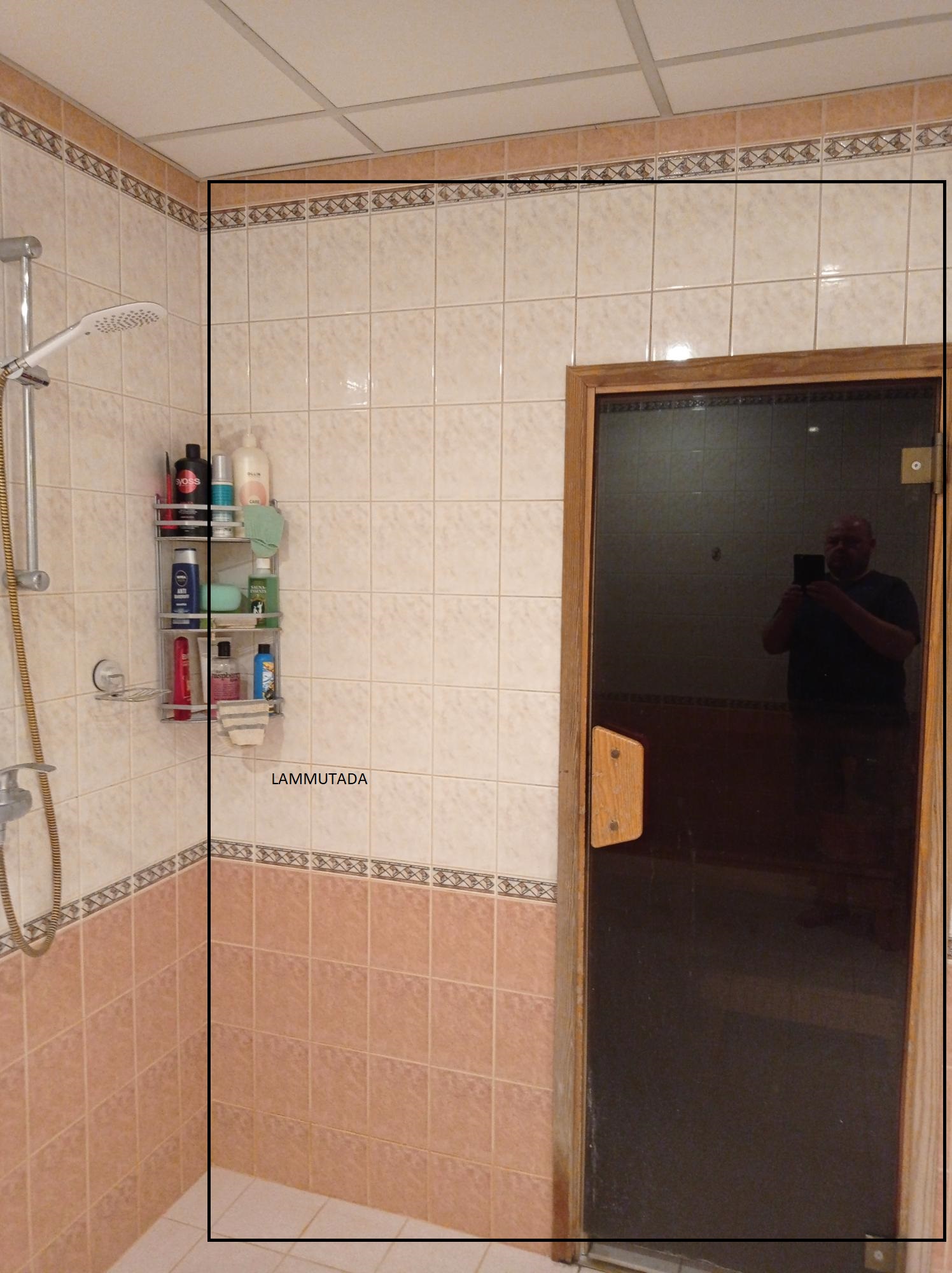 4. Lammutada sauna ja dushiruumi vaheline kipssein. Seina laius 1,6m, kõrgus 2,6m. Fotol sein sauna uksega.