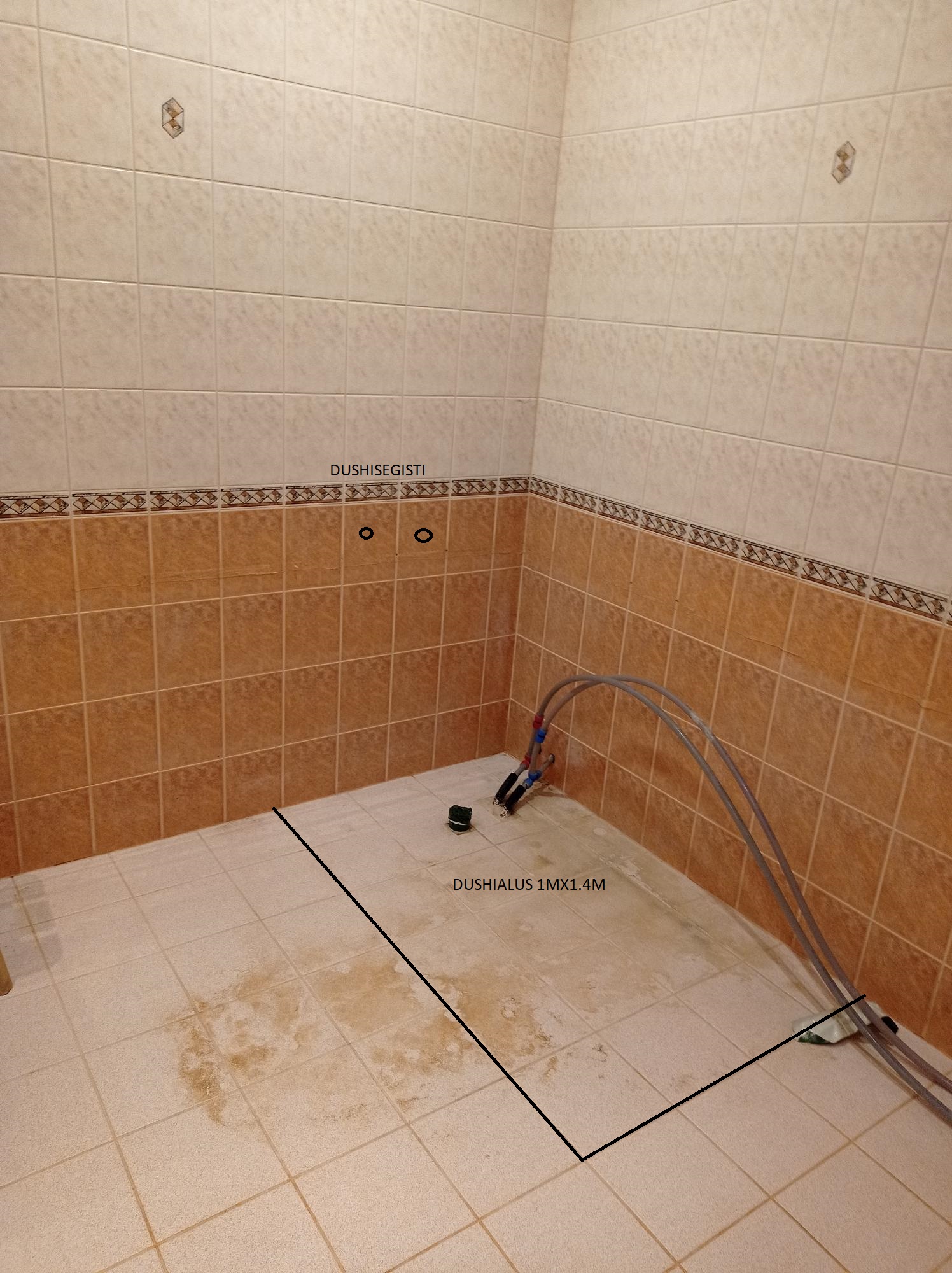 5. Ehitada dushilaus, näiteks Wedi renniga dushialuse plaadiga. Foto ”dushinurk”. Kanali ots on näha fotol veetorude kõrval.