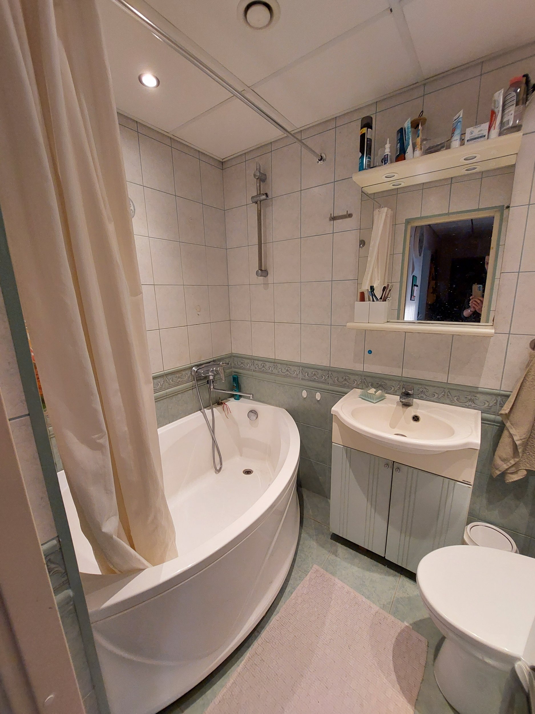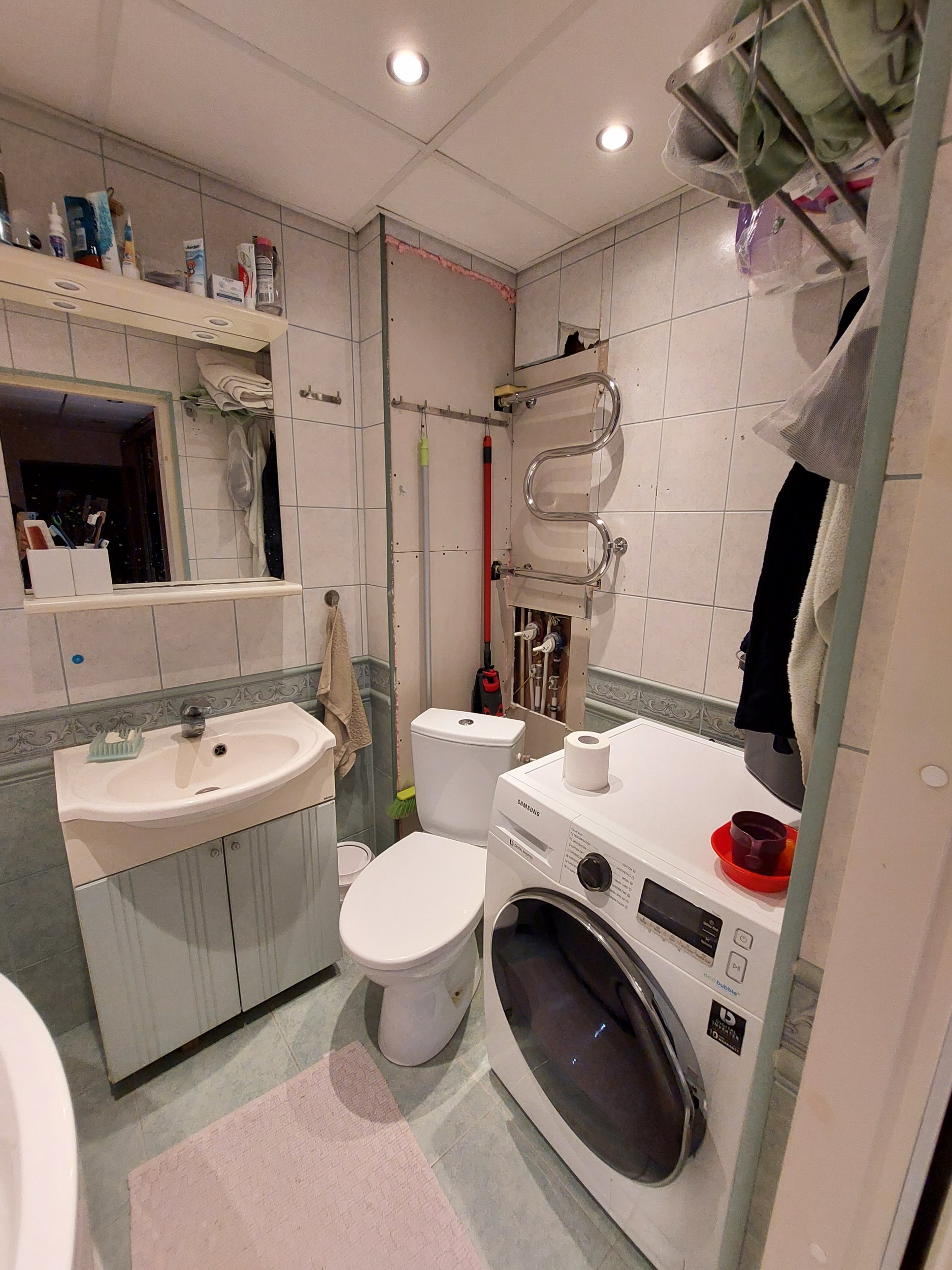 Olemasoleva keraamilise plaadi eemaldamine, torutööd (uute segistite paigaldus), elektritööd (ventilatsiooni ja valgustite paigaldus), uued plaadid seina ja põrandale, mööbli paigaldus. Vann, wc-pott ja pesumasin jäävad samad.
