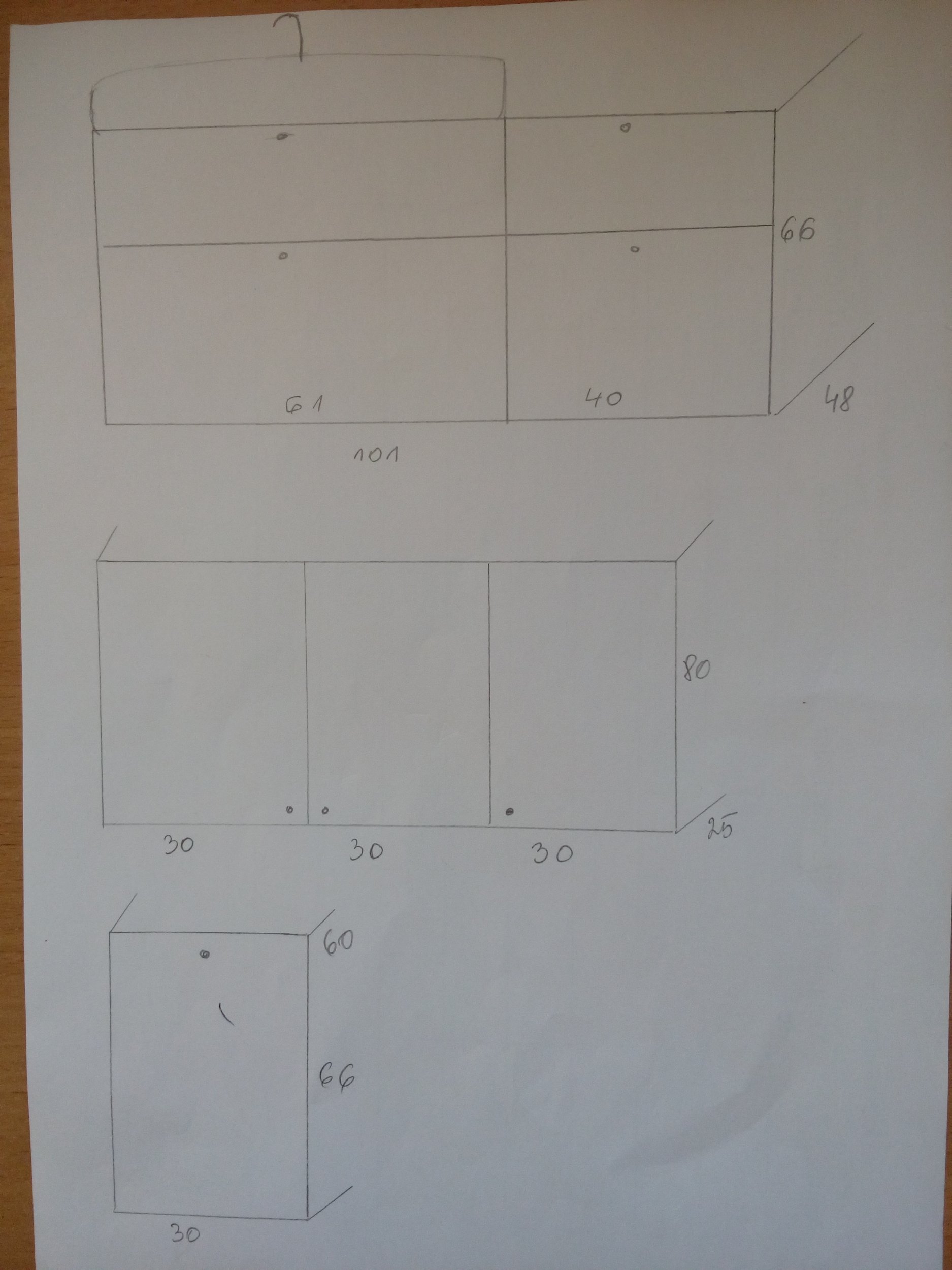 1. Valamualune sahtlitega kapp mõõtudega 101 cm laius * 66 cm kõrgus * 48 cm sügavus;
