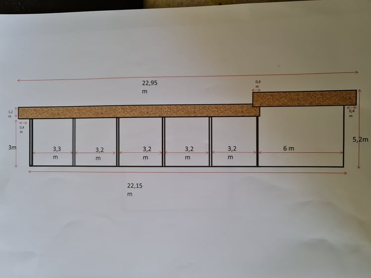 Varjualune. Paika pandu torud valamiseks 25x110cm. Vajalik kõrguseid kontrollida ja diagonaalid. Valada kannud täis lisades keermelatid etteantud mõõtudele. Kogus 12tk.. Edasi läheks 15x15 puit postidega ja ülemise vööga. Vermid tulevad tehasest ja oleks ainult kinnitada ja toestada, kile+roov. Katuseks tuleb plekk. Seinad püst laudisega 0,5cm vahedega.