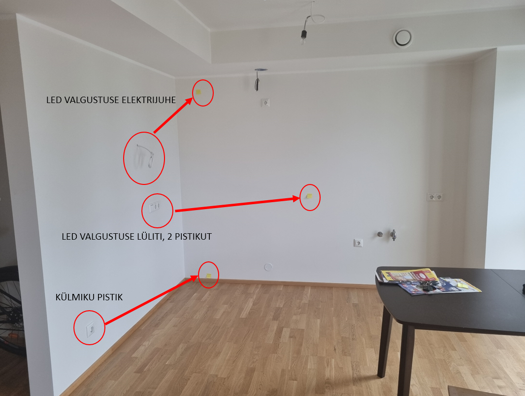 Otsin tegijat, kes teeb pisemat sorti elektri ja ka viimstlustööd Tallinnas (Pikaliiva kandis) uusarenduse korteri tühjas köögis. Lüliti, kaks pistikut ja valgustuse juhe, tuleks vastavalt meie soovitud köögipaigutusele ümber tõsta kõrvalseina, kuhu köögitehnika ja -mööbel tuleb (asukohad pildil näidatud). Sellel seinal, kus need praegu on, tuleks siis pärast ümbertõstmist teha viimistlus ka (Seinte värvimisel kasutatud Vivacolor Wall 4 värvi ja värvitooniks on F485, seinad kipsplaadist). Nurgaga köögipaigutuse asemel tuleb ainult ühes seinas paiknev köök...