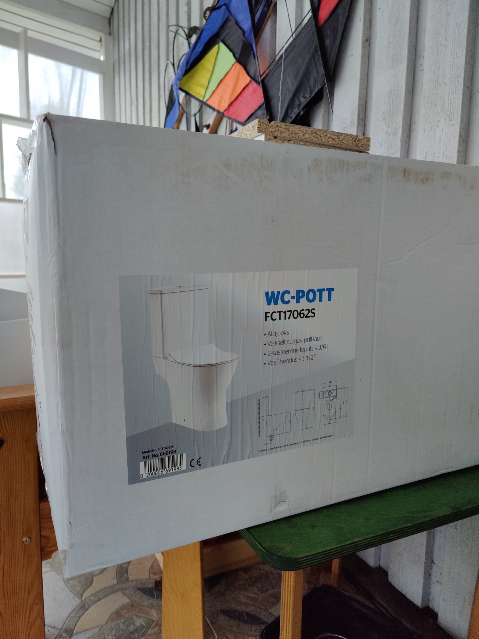 Vana WC poti demontaaž. Uue WC poti paigaldus (WC pott on tellijal olemas juba). Vana WC poti võtab töö teostaja kaasa ja võib seda oma äranägemise järgi kasutada (vana pott põhimõtteliselt töötab, aga aeg-ajalt on probleeme vee kinni jäämisega ja vee peale tulemisega, sellest ka tuleneb vajadus vahetada). Mõlemad WC potid on allajooksuga. Uus WC pott on selline nagu lingil näha https://www.bauhof.ee/et/wc-pott-fct19062s-allajooks-sujuvalt-sulguv-prill-laud-669198