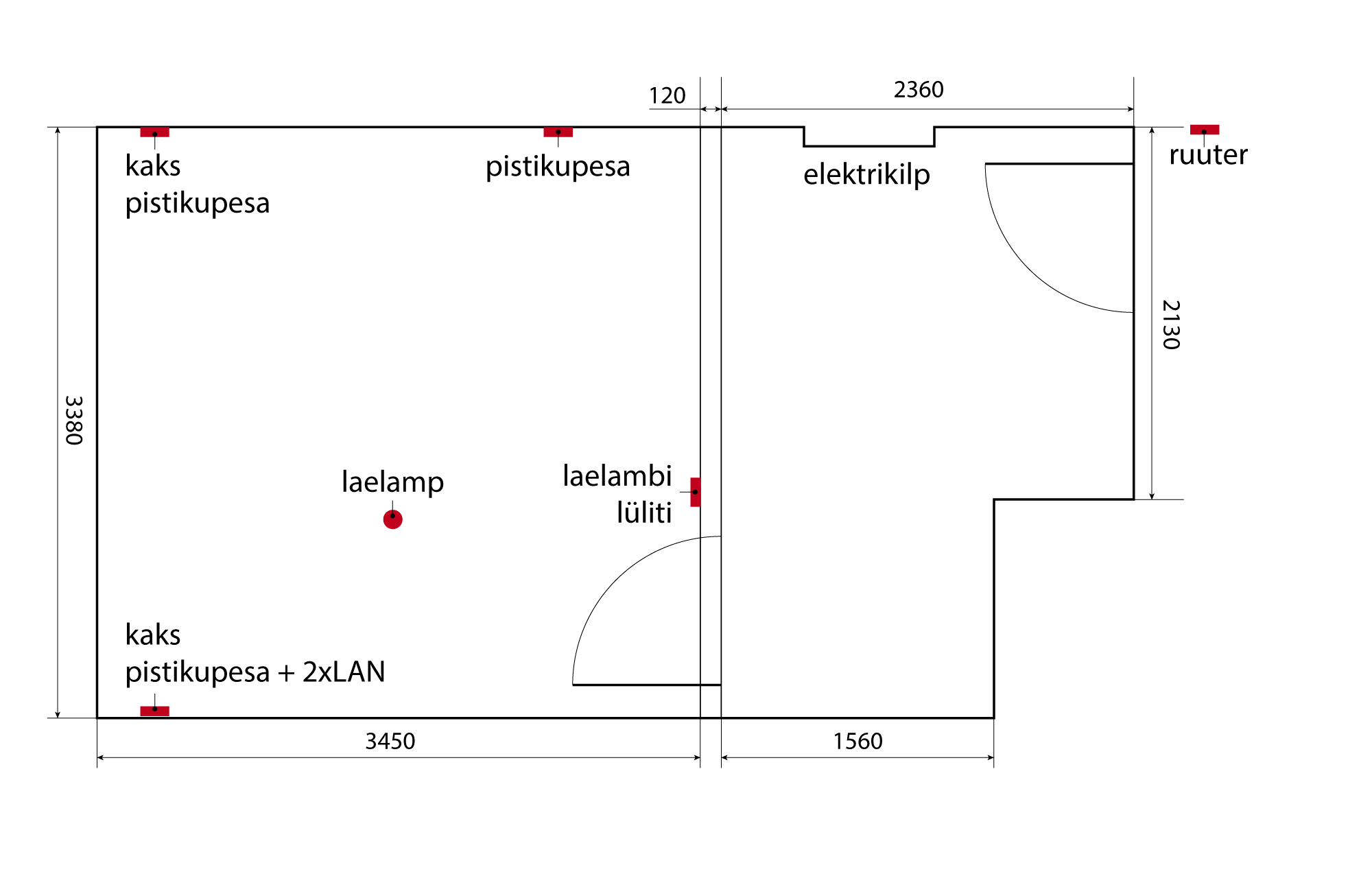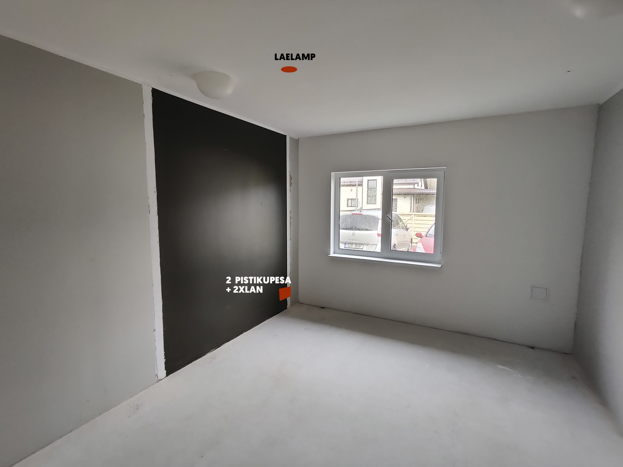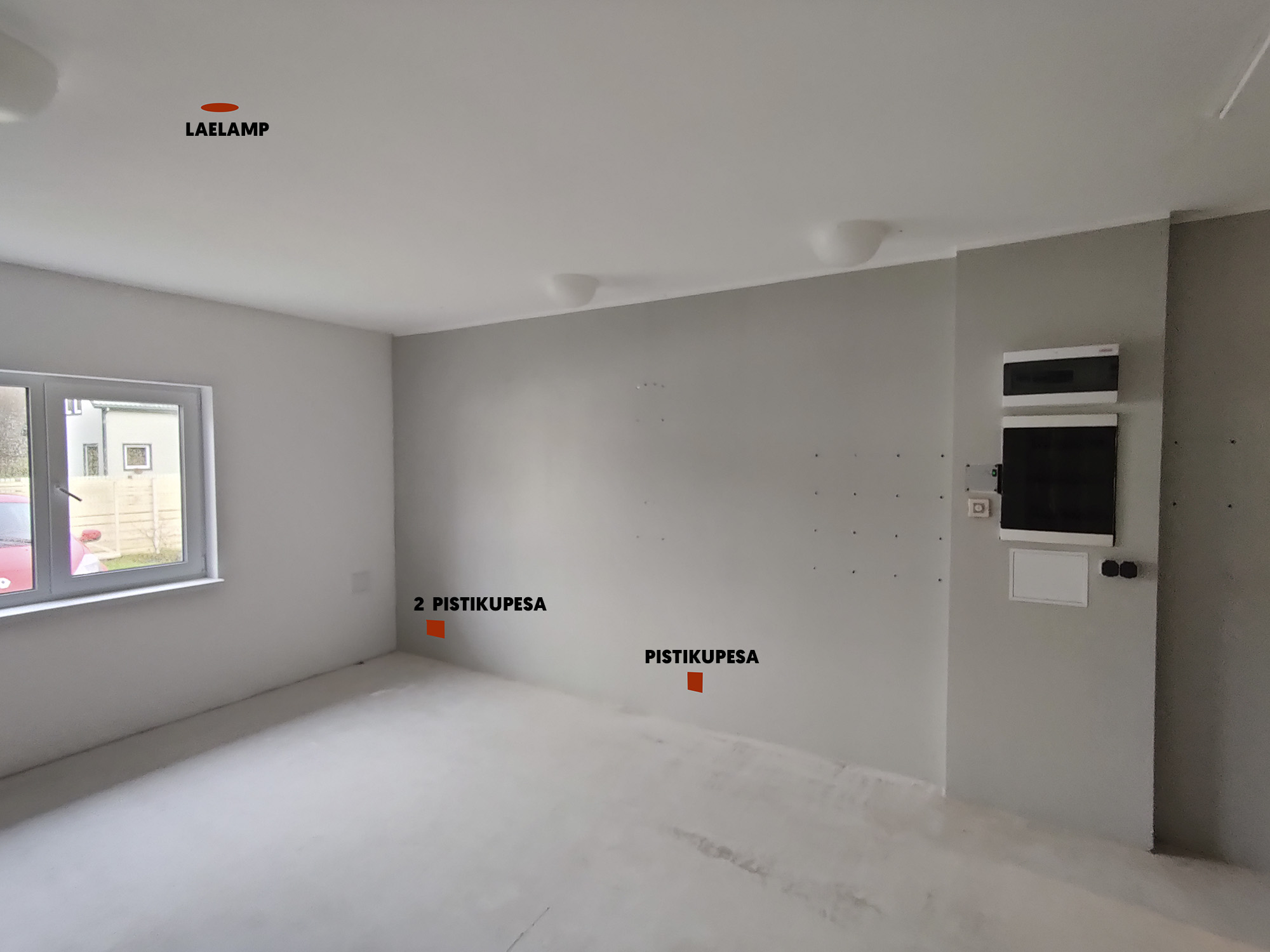 Elektri- ja LAN-kaablite paigaldus garaažist ümber ehitatud uues toas eramajas. Pistikupesade ja lüliti umbkaudsed asukohad on näidatud joonisel ja fotodel. Seinad on kaetud kipsplaadiga, võimaluse korral eelistaks kaablite süvistamist seina sisse. Kilbist tuppa saab kaablid vedada pööningu kaudu. Joonisel märgitud vaheseina ruumis veel hetkel ei ole, kuid kui see saab enne elektritöid valmis, siis saab seal olema valmidus kaabli ja lüliti paigalduseks. Elektrikilbis on olemas reservis kaks 16A ja üks 10A automaatlüliti. Kahest LAN kaablist ühe pistikupesa läheks joonisel ja fotodel olevasse tuppa ja teine pistikupesa risti läbi vaheseina seina taga olevasse teise tuppa. Ruuter asub joonisel märgitud ruumist paremal pool asuvas tehnoruumis lae all, LAN kaablid saab sinna vedada samuti pööningult läbi lae.