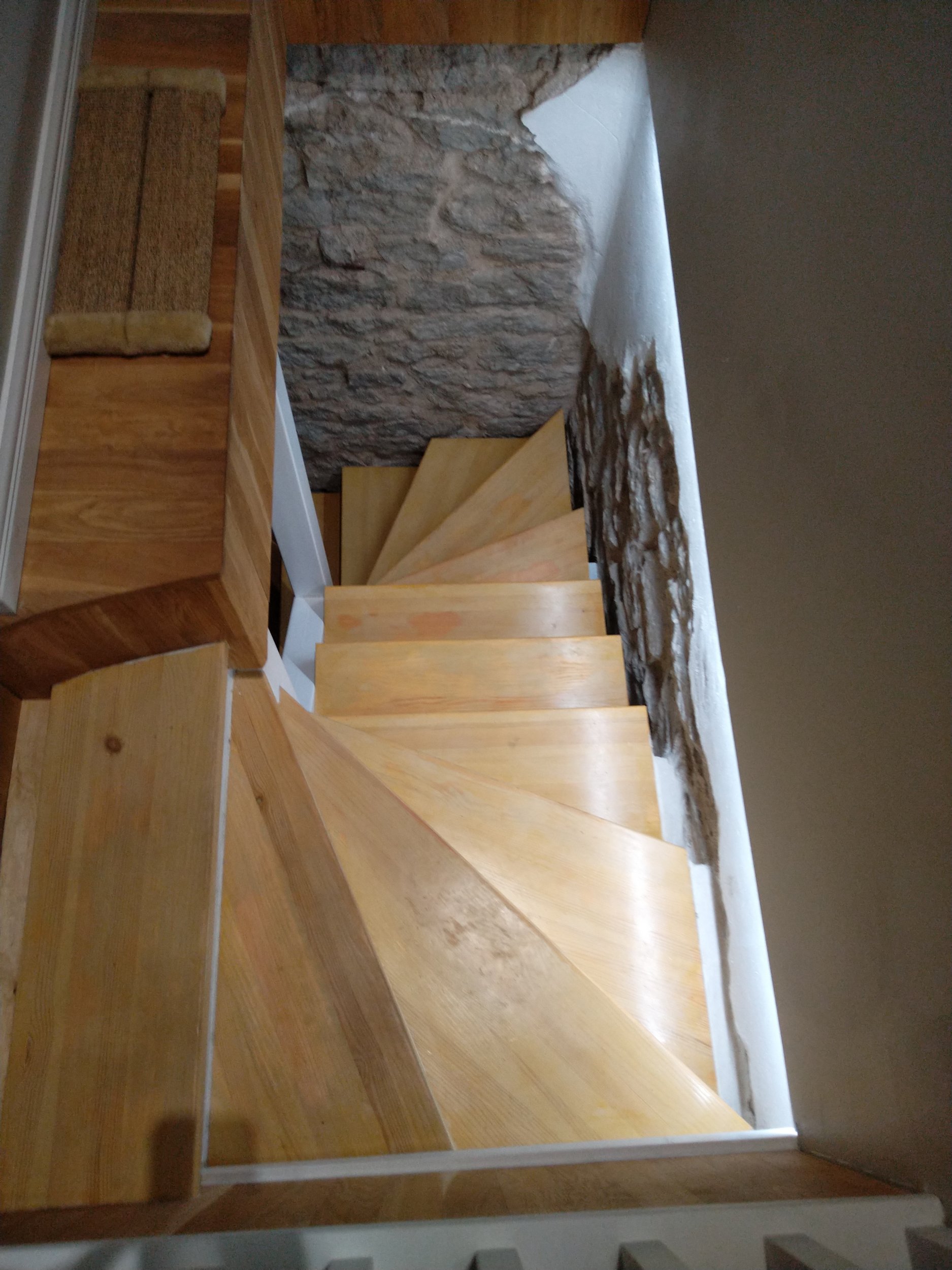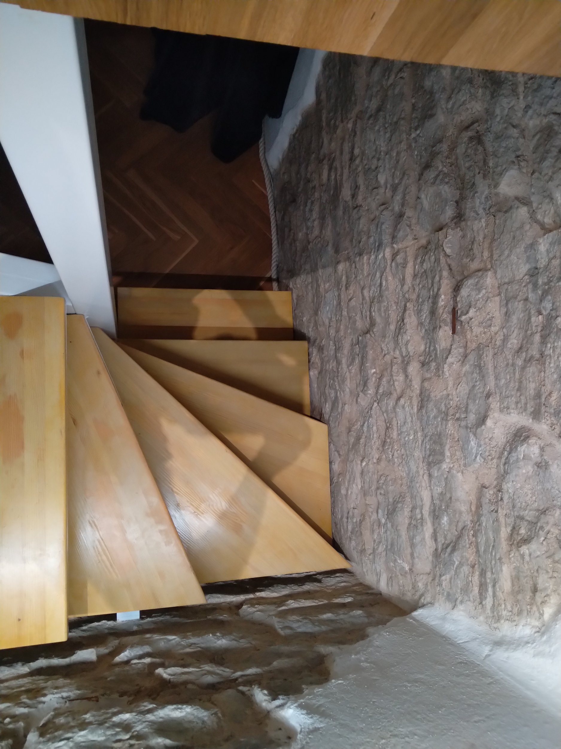 Vaja oleks ehitada trepile laskudes paremale küljele puidust käsipuu. Trepp viib 1. korruselt soklikorrusele. Enamik seinast on paekivi.