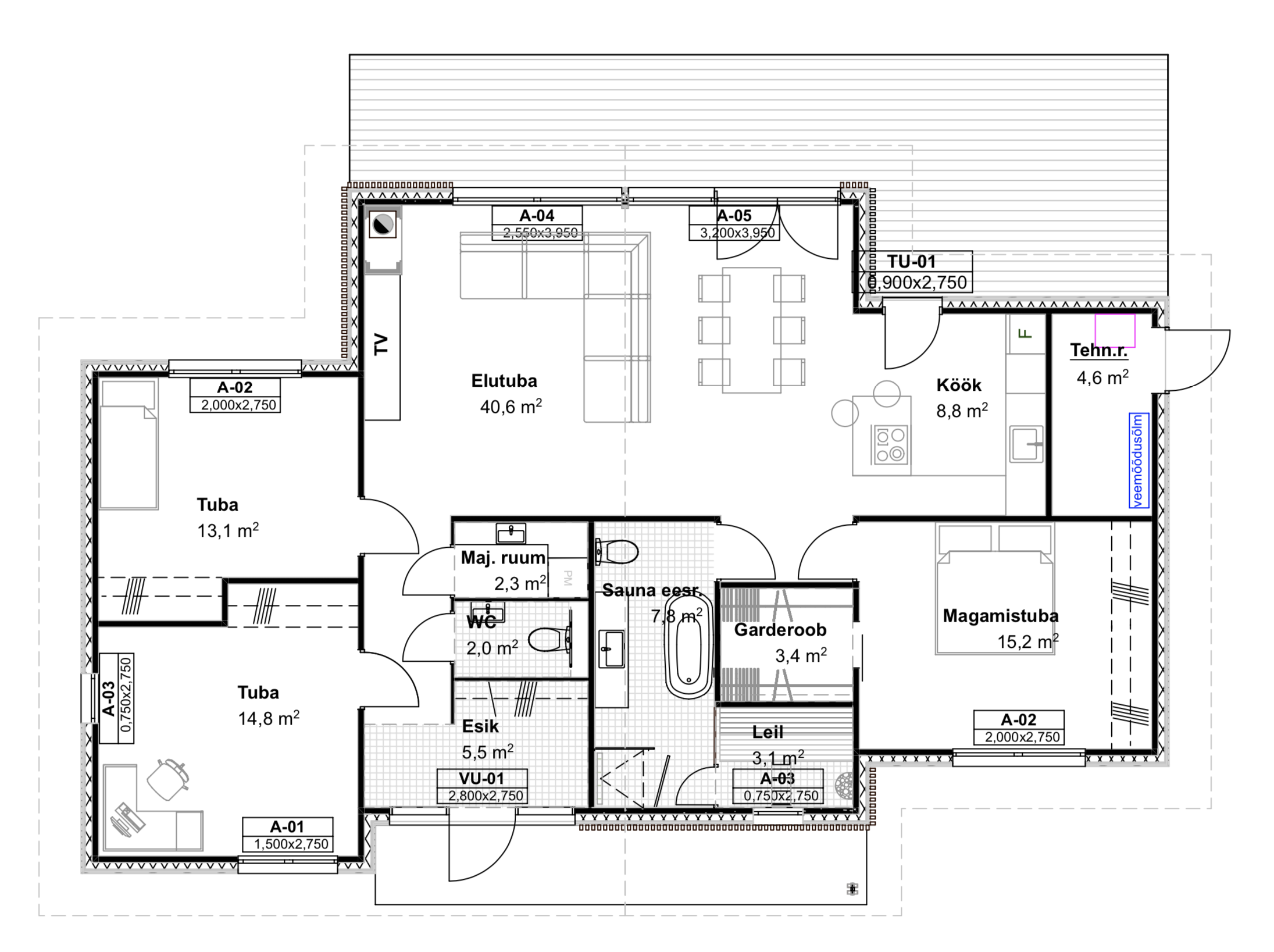 Ehitusloa taotlemiseks esitatav ehitusprojekt eramule. Projekteerimistingimuste taotlus hetkel veel menetluses.