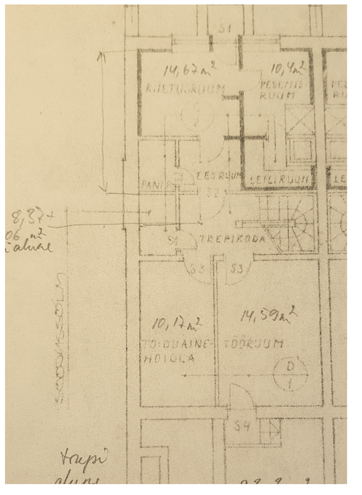 Teeksime joonised AutoCadiga. Majandusruumide korruse foto on väga viletsa kvaliteediga siin keskkonnas, juhul kui võidame, siis enne arvutisse ümberjoonistamist sooviks võimaluse korral paremat koopiat, võib ka paberkujul (Tallinnas).
