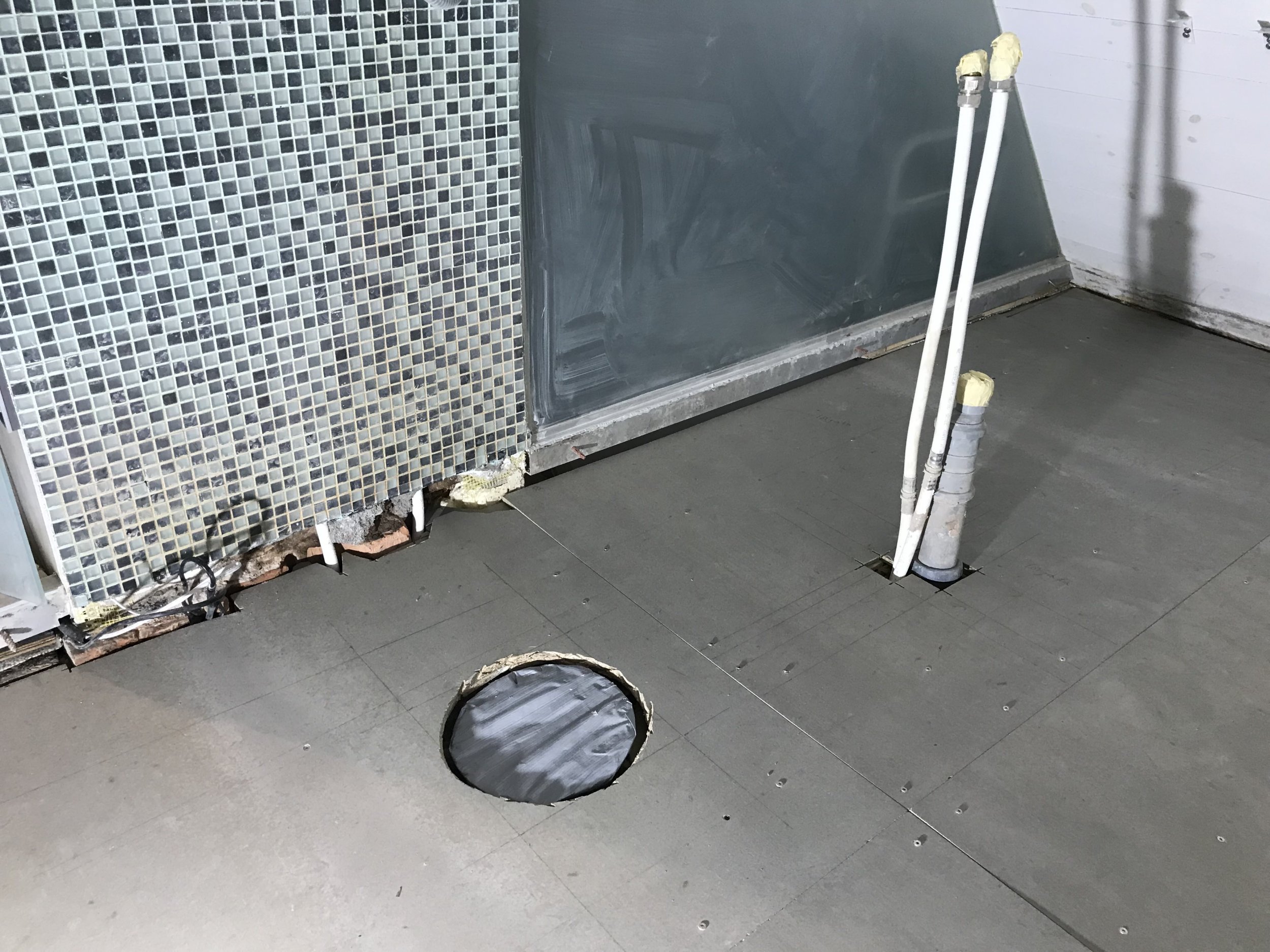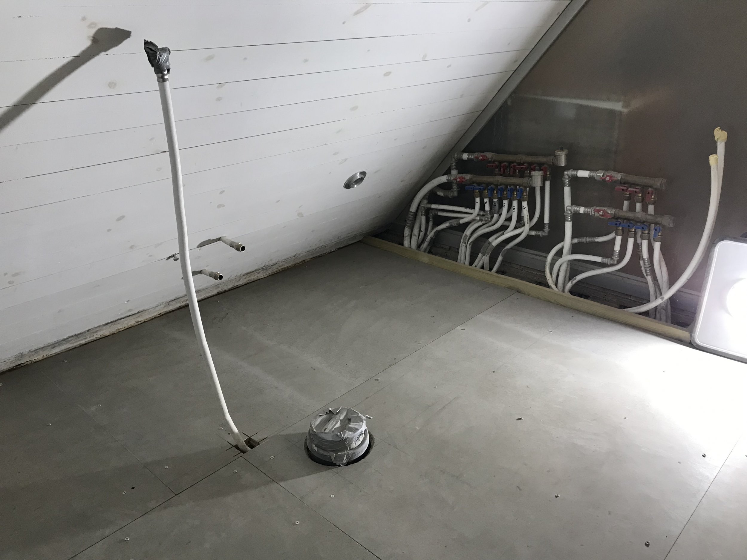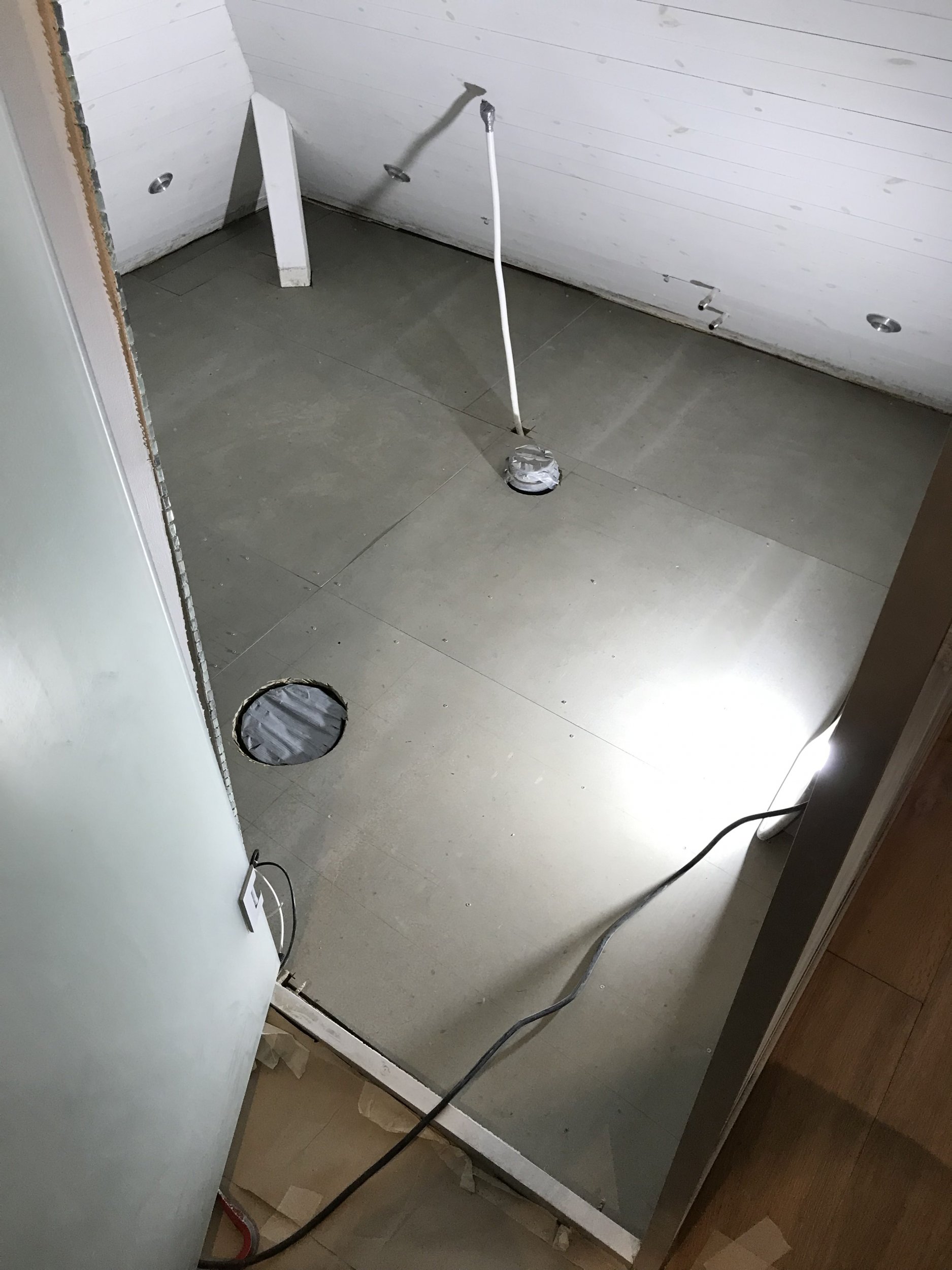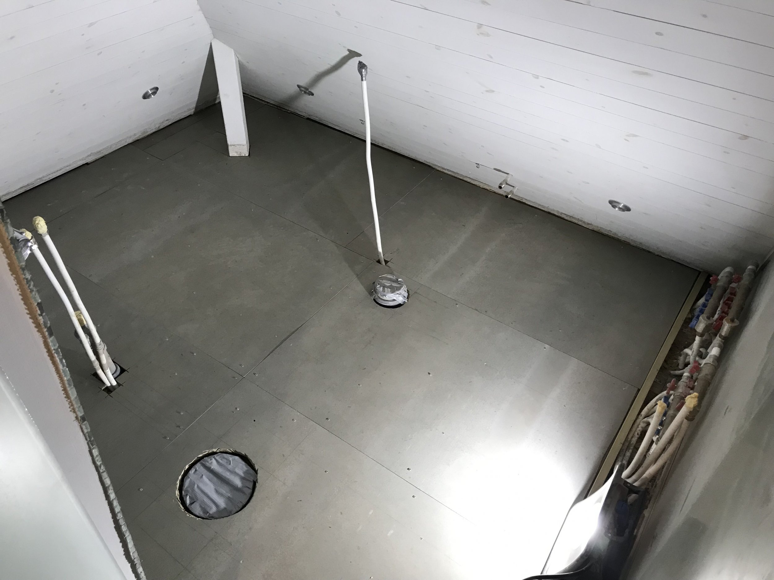 Alus on tehtud kahes kihis 8mm Stonerex Basic tsementlaast ehitusplaadiga. Nüüd vaja teha järgmine kiht (Tycroc või valamine + hüdro) koos põrandaküttekaabliga (elekter), paigaldada dušitrapp ja põrand plaatida ning viimistleda. Pakkumises palun välja tuua, kuidas teha eelistate - kas Tycroci või valuga. Plaadid on tellija poolt.
