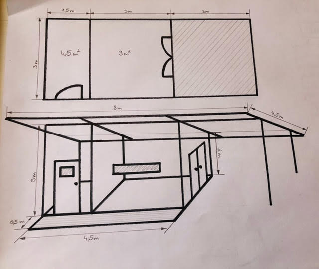 Kuuri ees väike 0,5m laiune terrass. Põrandad puidust, va varikatuse alune pind (sinna tuleb lihtsalt kruus). Värvimisega saan ise hakkama. Loodetavasti saab joonisest enamvähem aimu millist kuuri soovin. Omapoolsed soovitused ja head mõtted on teretulnud.