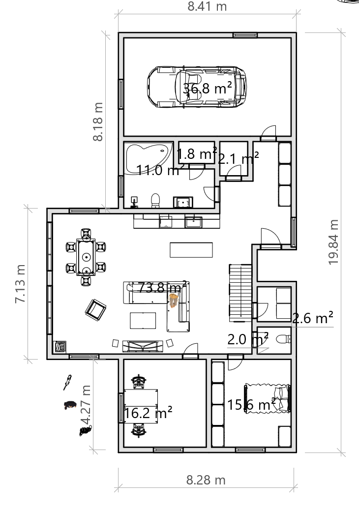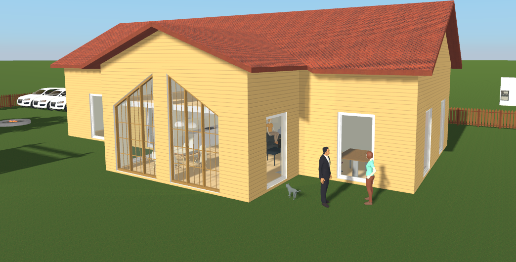 - avatud elutuba köök, kõrge avatud laega, suurte otsaseina akendega