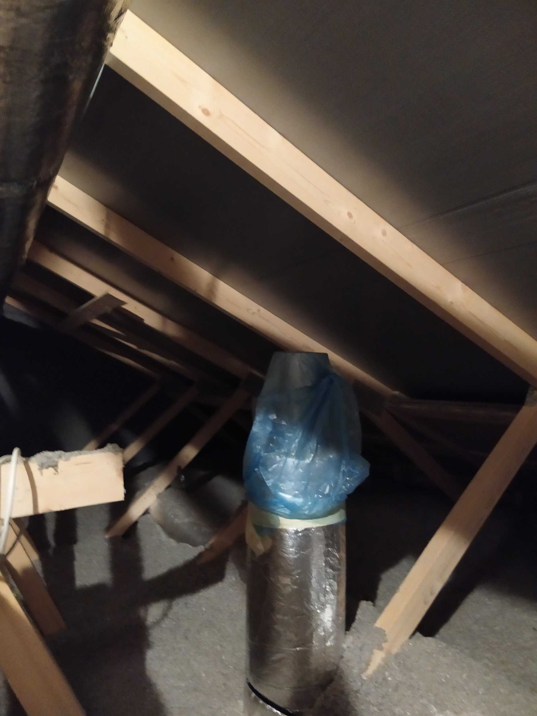 Köögi õhupuhastile ventilatsioonitoru paigaldamine pööningul, pööningul ventilatsioonitoru soojustamine ja väljaviigu paigaldamine.