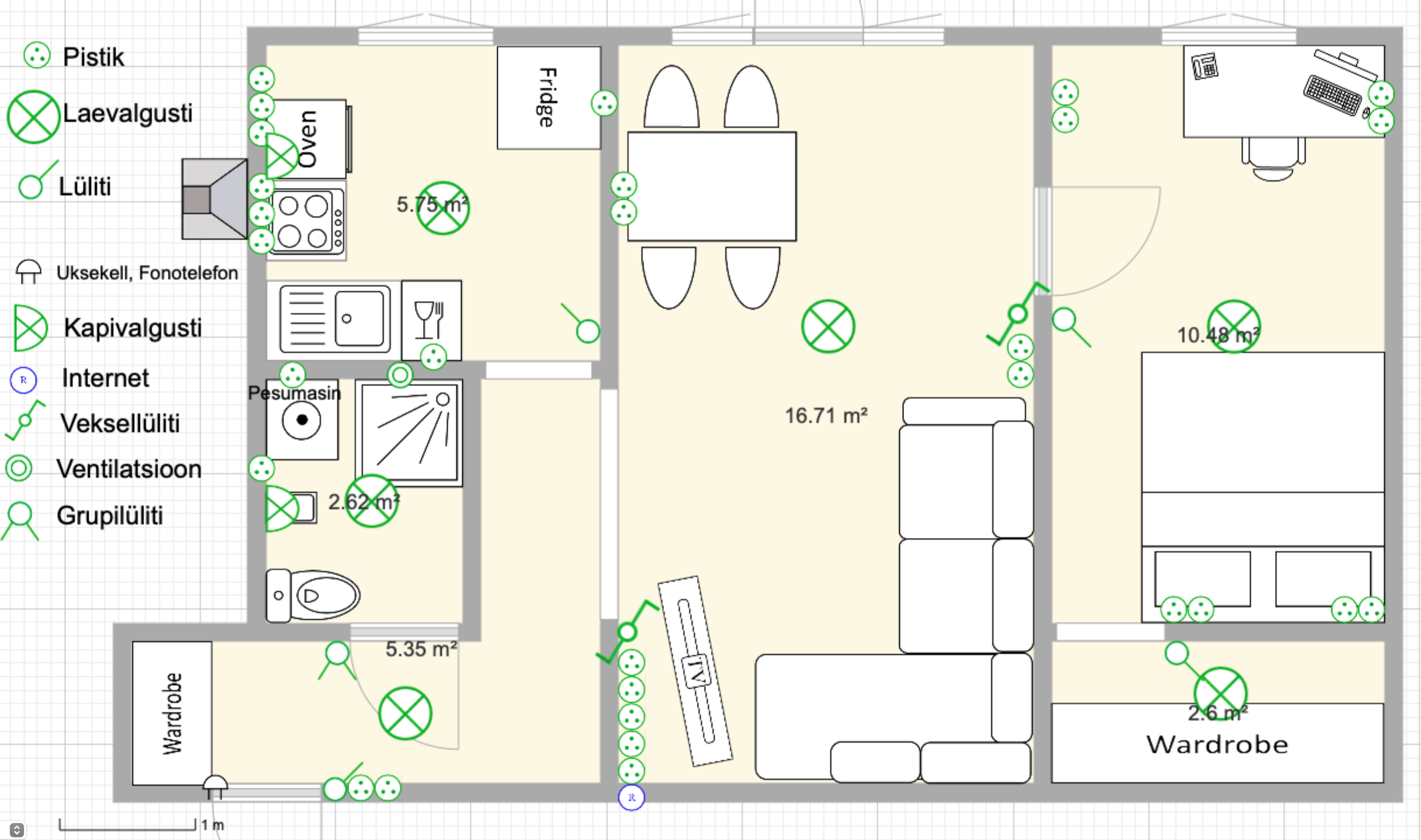 2-toalisse korterisse (45,1 m2) uute elektrijuhtmete, -pistikute ja lülitite paigaldmine.