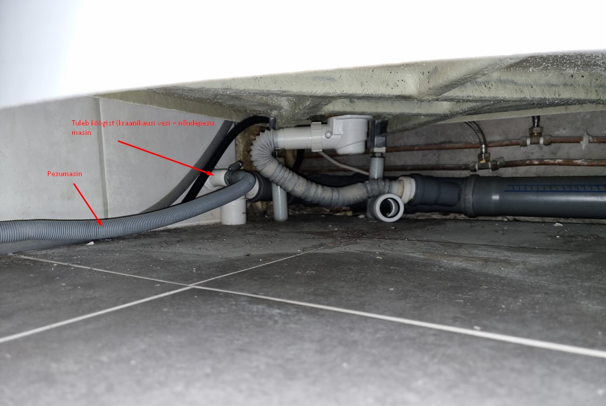 2. Lahendada paremini pesumasina äravoolu ühendus, kuna praegu jooksevad kokku pesumasin ja nõudepesumasin ning väidetavalt pole see turvaline lahendus. Pesumasina äravoolu toru kinnitada ka korrektsemalt seina külge ja vajadusel välja vahetada pikema vastu.