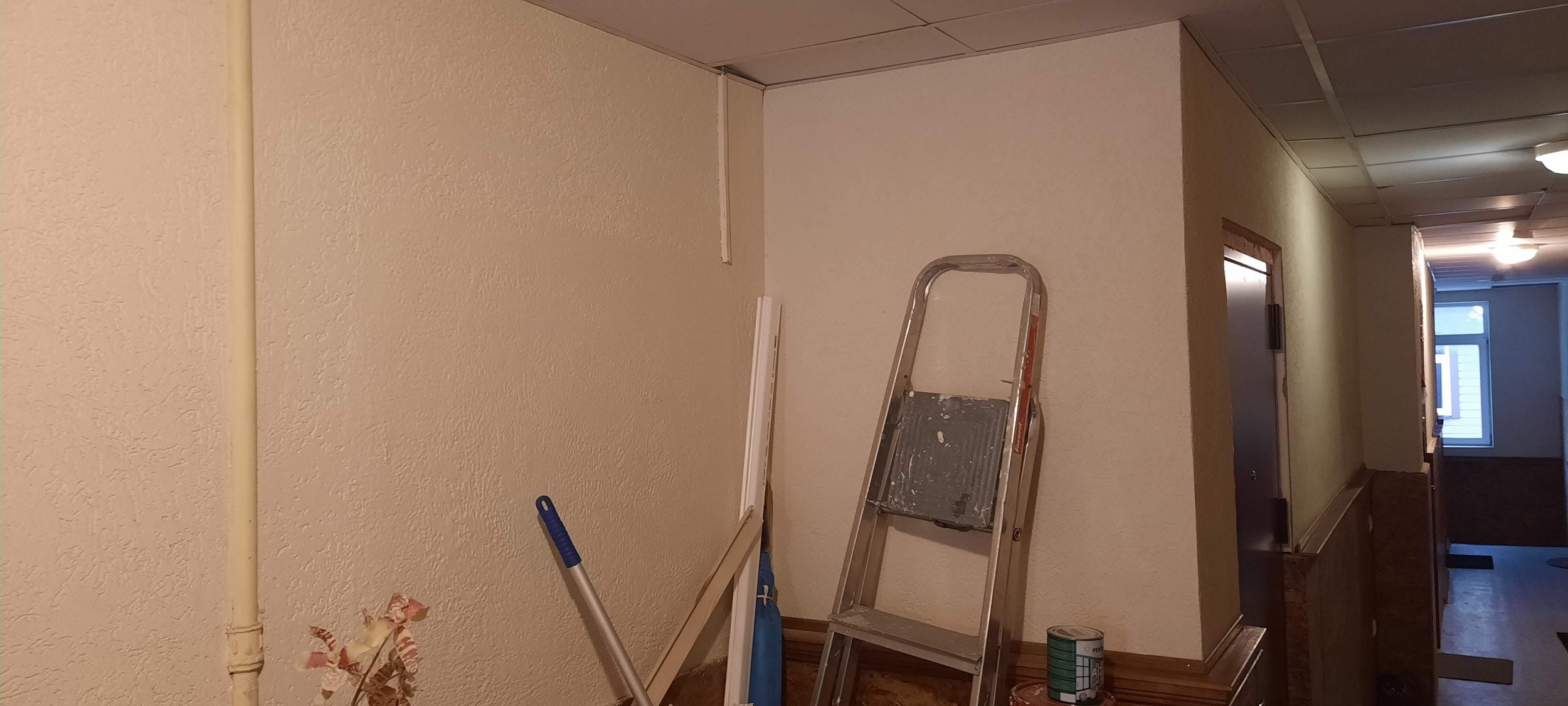 Hetkel on sein osaliselt viimisteltud struktuurkrohviga, kuid kohati erineva struktuuri ning tooniga. Uksepaled vajavad tegemist. Uue struktuurkrohvi paigaldamise eesmärk on uksepaled viimistleda ning ühtlustada seina väljanägemine. Ma ei tea, kas neid krohve toonida saab, aga toon võiks olla võimalikult sarnane helekollane ning teha sarnase mustriga. Teatud erinevus olemasoleva seinaga ilmselt jääb.