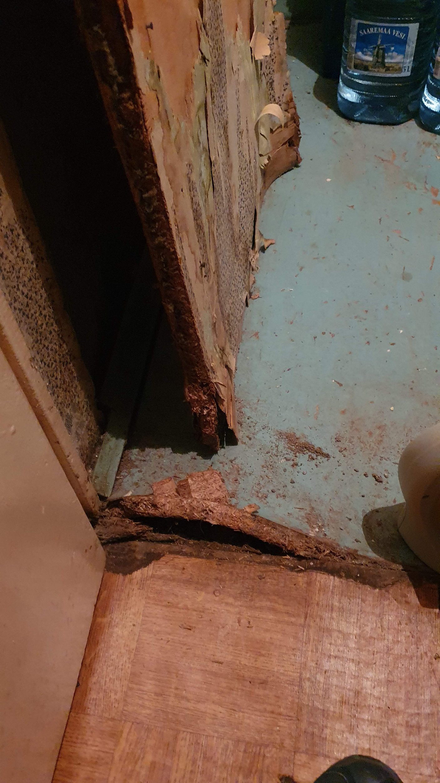 Sarnaselt on põrandaks mingi vana plaat, mis vee kahjustuse tõttu sai kannatada ja kerkis üles. See on samamoodi vaja asendada sobiva puitplaadiga.