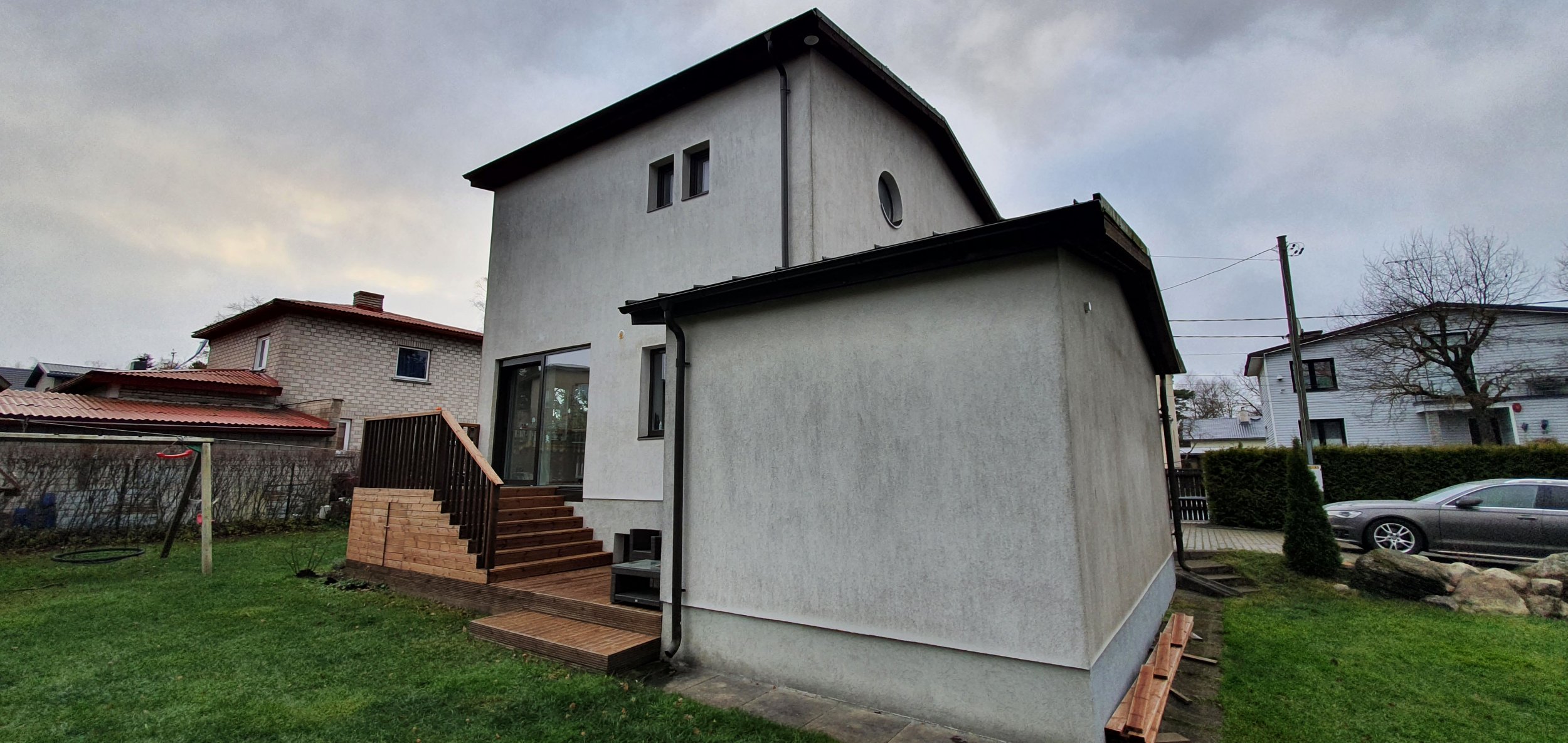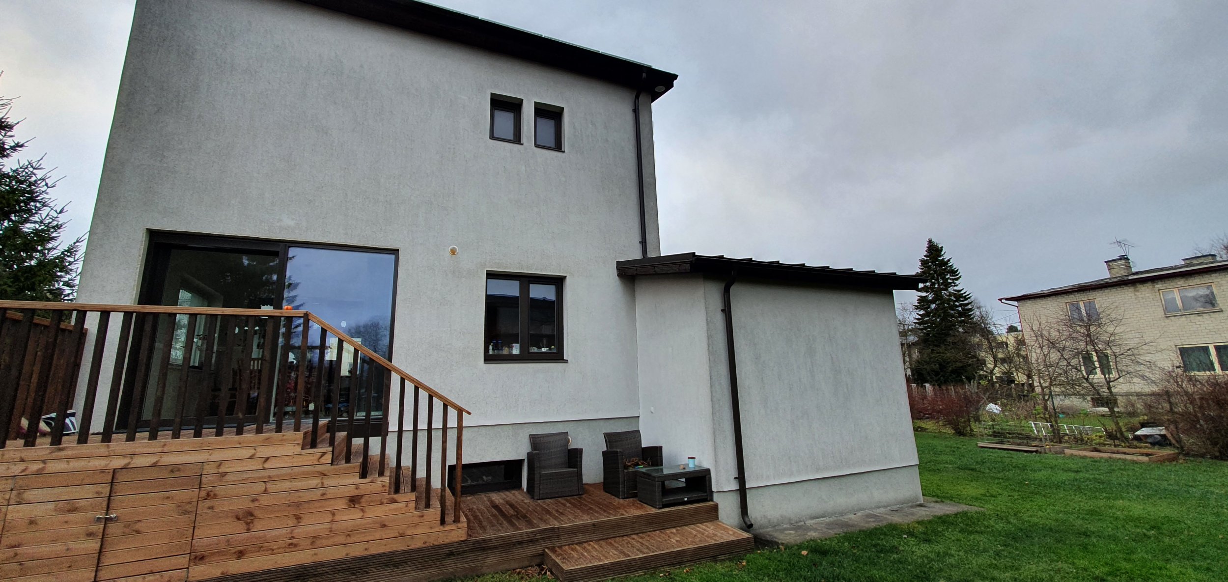 1) kõrgus selliselt, et läheb ülejäänud maja katusega samale tasemele ning sama viilu pikendus.