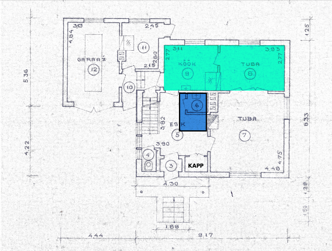 Tuba 6 ehk vannituba on enda kuju aja jooksul muutnud ning praegune kuju joonistatud siniselt.