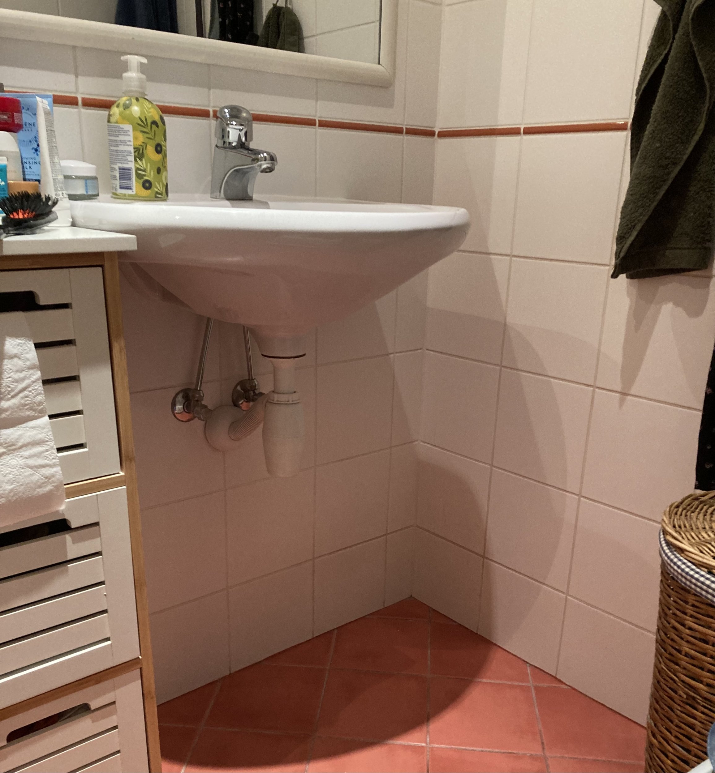Vannitoas oleks vaja kraanikausi asukohta muuta umbes 50cm senisest kohast, et saaks paigutada pesumasina selle kõrvale. Siiani on pesumasin olnud köögis, st. võimalused selle paigutamiseks vannituppa tuleb luua.