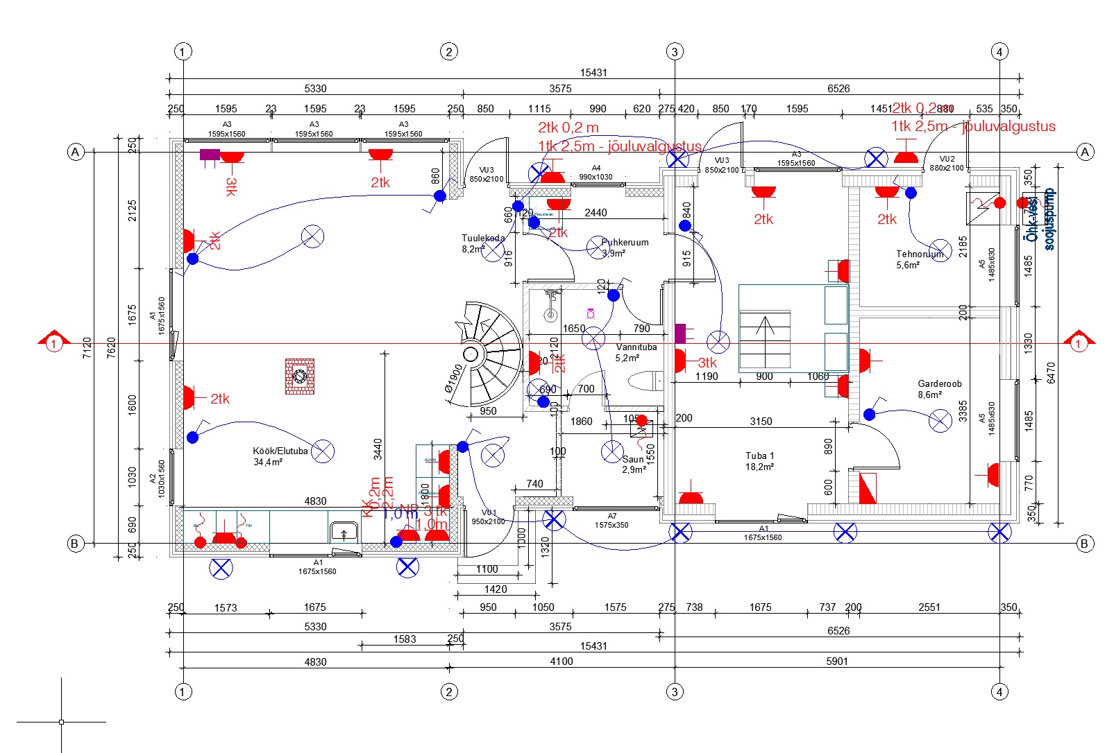 Elektripaigaldiste põhjalik Tööprojekt ehitustööde teostamiseks. Töö teostamiseks on Tellijal vajalik esitada dwg joonised. Kinnistu välised võrgud ja targa maja automaatika ei sisaldu hinnas ja on vajadusel eraldi kokkuleppel. Nõrkvooluprojekt (valve, side) on soovi korral lisaks 100. Töö esitatakse digitaalsel kujul. Paberkausta hind vajadusel on 50€/tk.