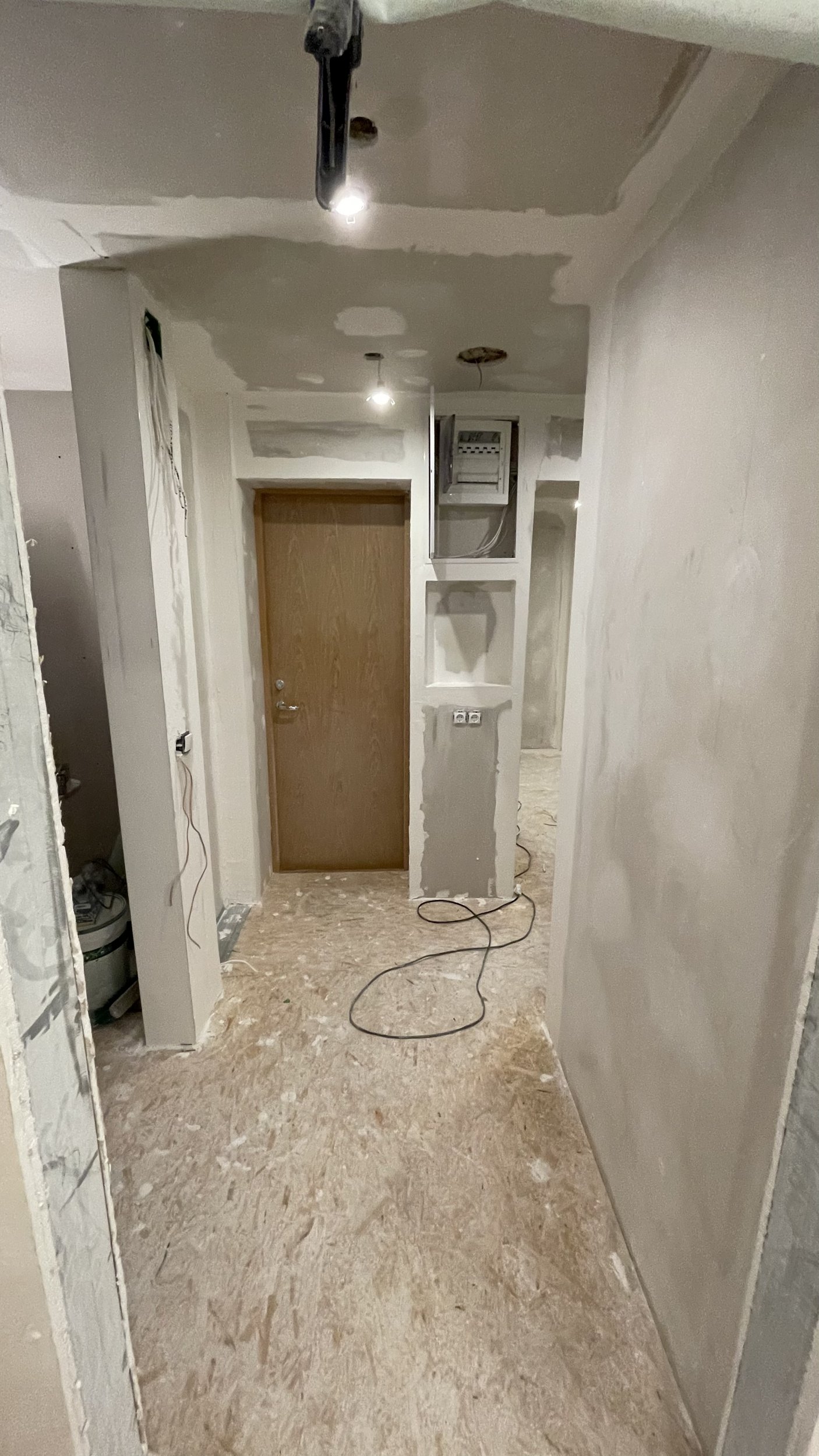 Magamistoal ja esikul on esimene kiht pahtlit juba pandud ja osaliselt lihvitud - vajaks parandamist ja viimistlemist. Elutuba/ köök vaja nullist pahteldada.
