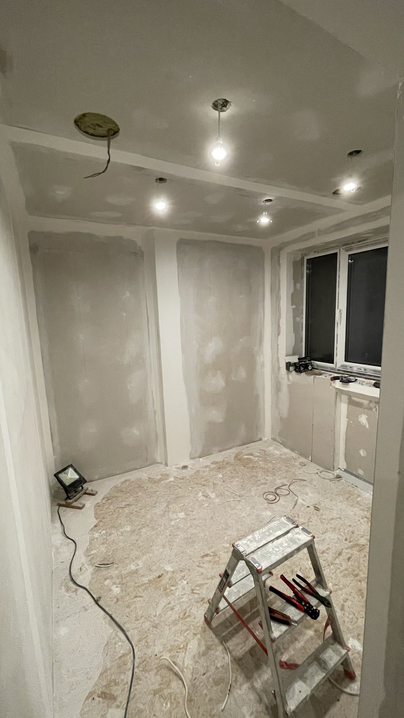 Oma jõududega tehtud 13 ruutmeetrine ruum ja eraldi tegemisele läheb 5 ruutmeetrine vannituba, seega pakkumine teha 32ruudule (magamistoa, esiku ja elutoa/ köögi jaoks). Seinad+lagi.