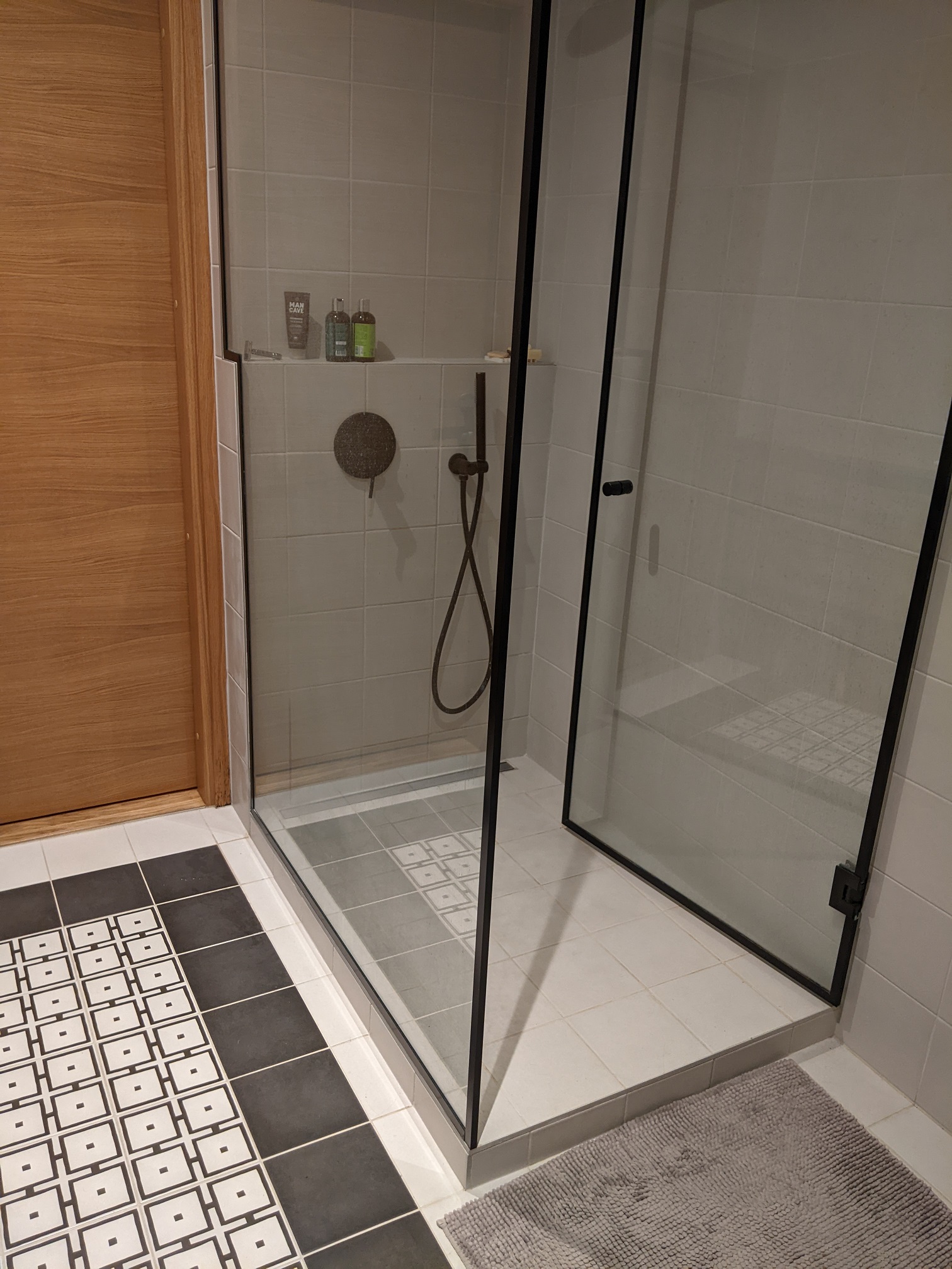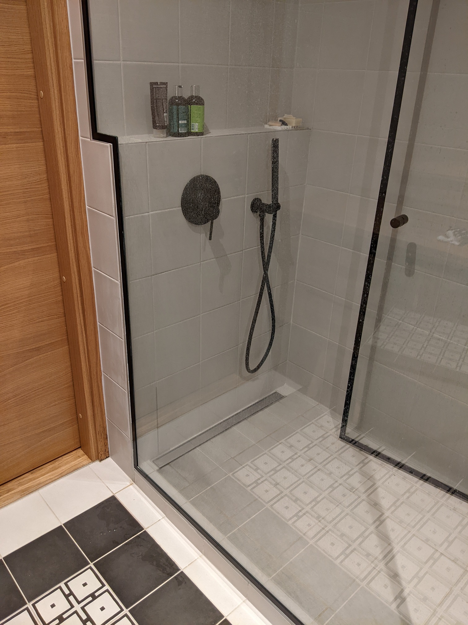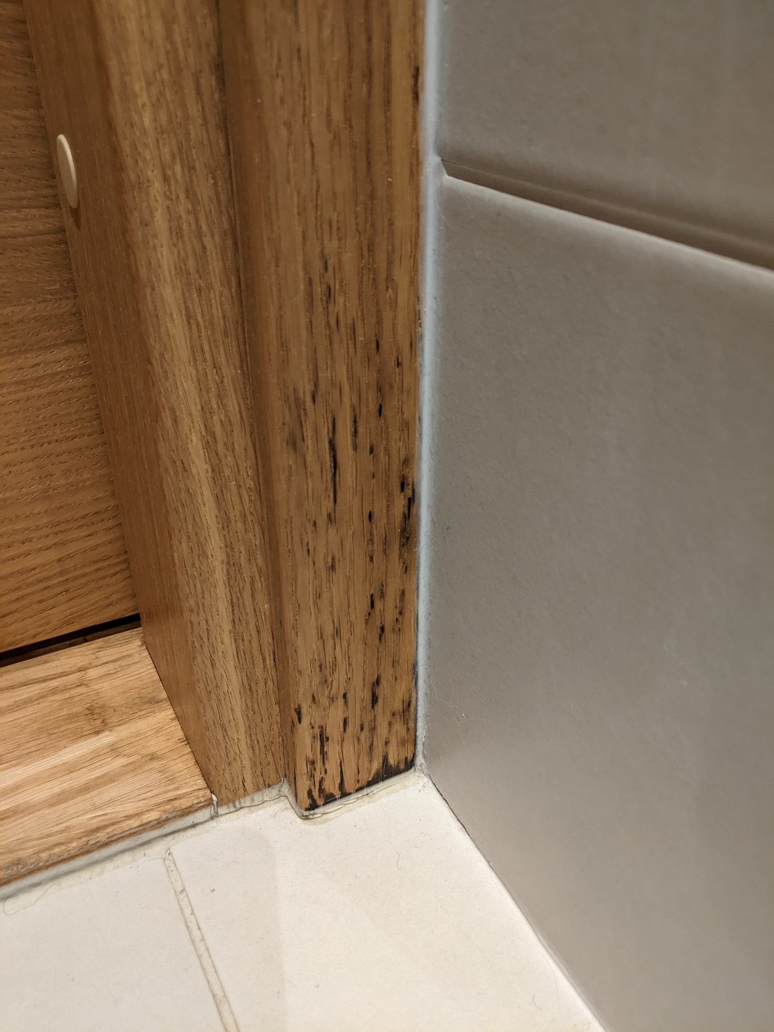 Kahjustada on saanud ka vannitoa ukse piirdeliist ja lävepakk, mistõttu võib arvata, et vett lekib aeg-ajalt ka ukseliistu taha jääva seina äärest. Dušinurk on ehitatud nö lisakarbikuna, kuna esialgu oli vannituppa tehtud vanni paigaldamise valmidus.