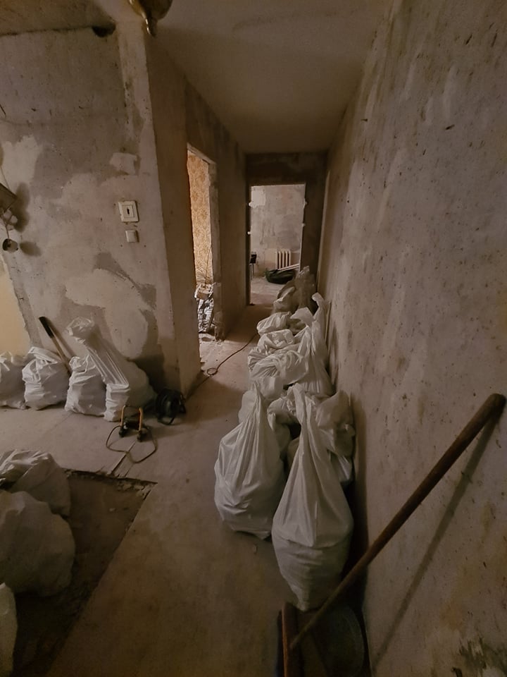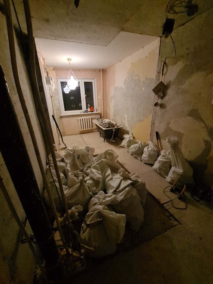 Neljanda korruse korteri ehituse koristus. Kottides on betoonitükid. Suurusjärk on 5/7 vannitoaboksist.