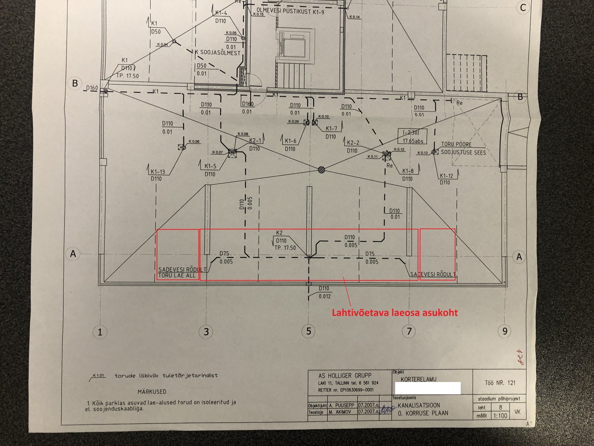Seoses sadevee püstaku lekkega on saanud lagi veekahjustusi ja tuleks eemaldada osaliselt kipsplaat ning vill, korrigeerida sadevee torustik (paigaldada ühenduskohad kokku tagasi) ja taaspaigaldada materjalid/ asendada osaliselt uuega.